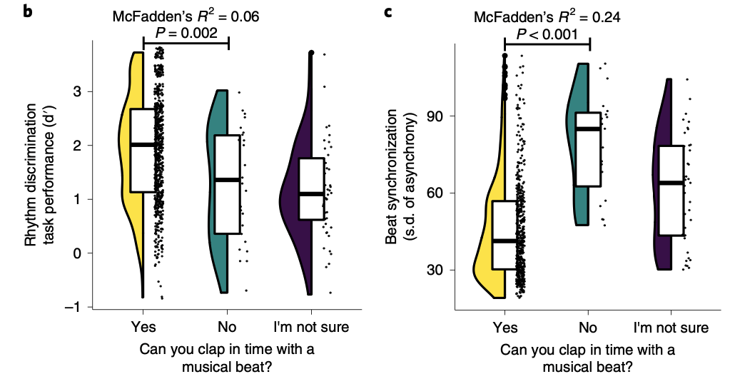 In short, yes! The clap-beat self-report is a good proxy for beat synchronization. In a series of internet-based experiments (run in separate samples from the genetic studies), we performed phenotype validations (experiments validating that the self-report questionnaire item) by asking people to complete musical rhythm tasks and respond to questionnaires.