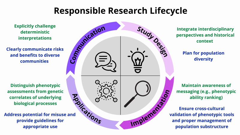 Individual differences, human genetics, and musicality each have a long history of being discussed in contexts that are embedded in racism (including the abhorrent and scientifically inaccurate theories of eugenics). It is especially important to be aware of this history, and proactively work towards principles of diversity, equity, and inclusion in this research, moving forward. To this end, several members of the authorship team joined forces with two outside experts in musicology and bioethics to put forth a set of guidelines for ethically and socially responsible conduct of musicality genetics research. These guidelines are discussed in a recent preprint, and also summarized in the Nature Human Behaviour paper (see Box 1). In brief, incorporating principles of ethically and socially responsible conduct of musicality genetics research can be infused into each stage of the research lifecycle: study design, study implementation, potential applications, and communication about the research.