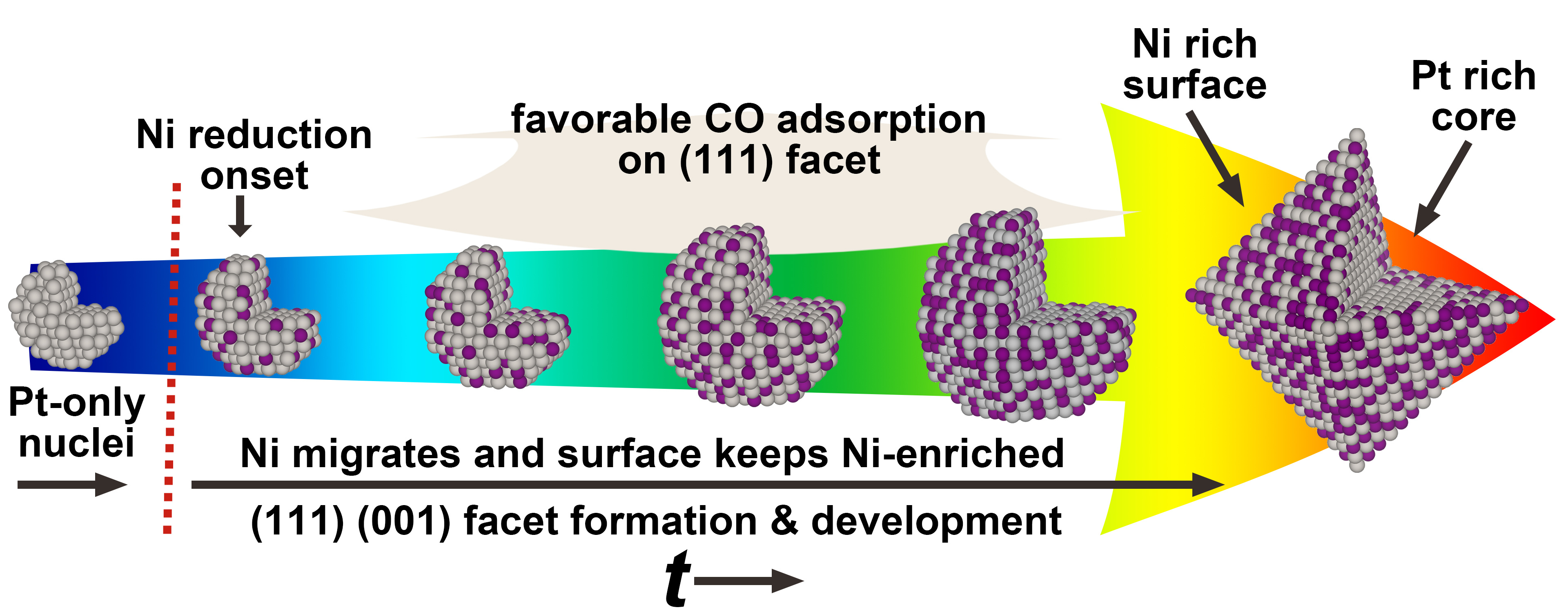 The current results indicates a “synergic effect” between Pt and Ni atoms that contribute to the formation of octahedral shaped nanoparticles, which is pretty interesting. We found that during the growth process, Pt was first reduced and forms the Pt nuclei. And then the Ni was catalytically reduced by the prior reduced Pt (control experiments confirm that pure Ni precursor can not be reduced at the same condition). With continuing growth, a Ni enriched surface was revealed and we found that this enriched surface plays a significant role in the octahedra formation: the segregated Ni tuned the CO preferential adsorption facet from (100) to (111) that slowed down the growth rate of (111) facet and led to the (111) dominated morphology, i.e. octahedra. On contrary, for a pure Pt or non-Ni segregated condition, the CO preferential adsorption facet was still (100) that led to cubic nanoparticles. In a nut shell, Pt helps the reduction of Ni while Ni helps to guide the nanoparticle to become octahedral shaped, just like a good collaboration work from Pt and Ni atoms.