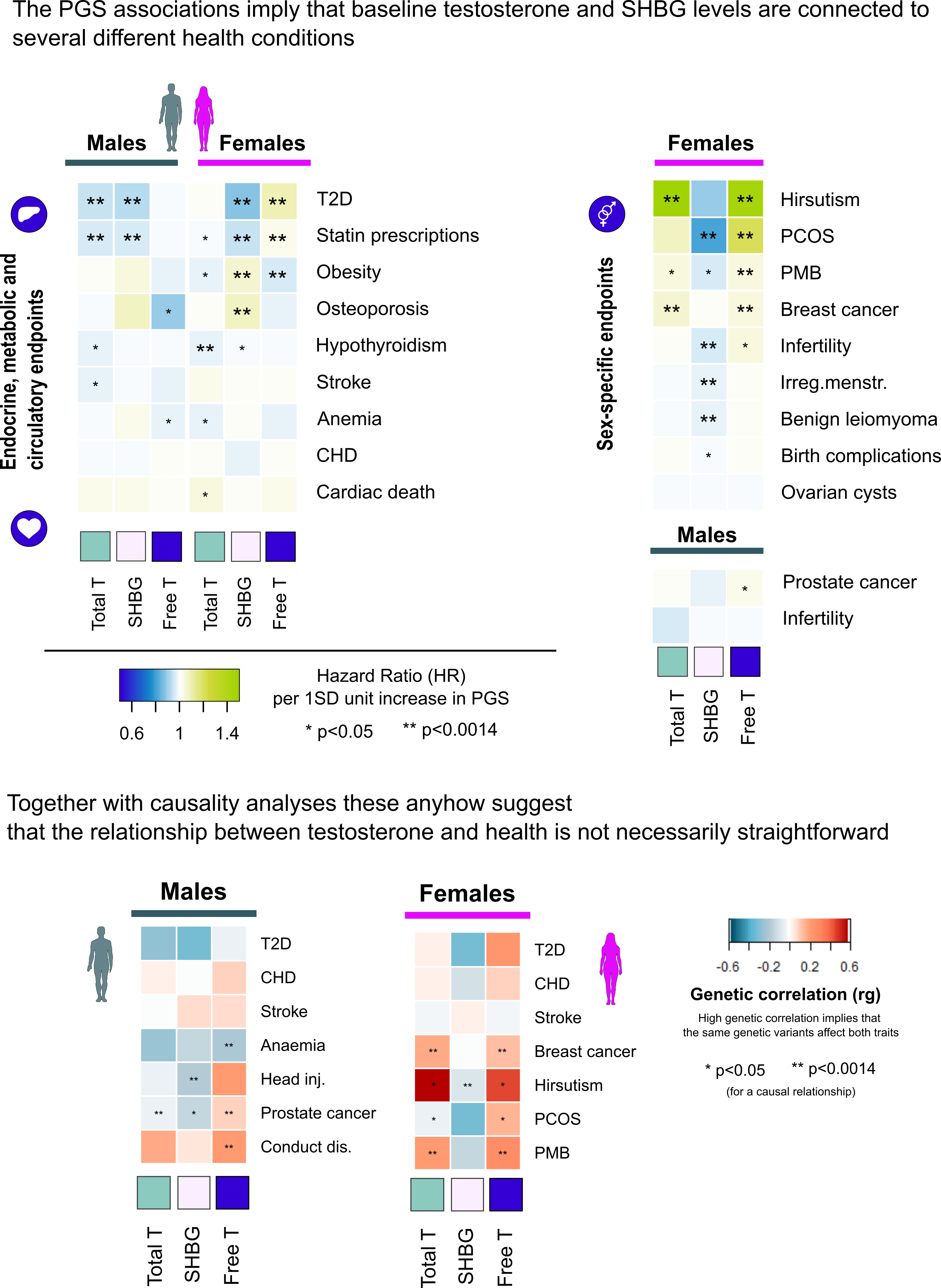 Overall, our findings highlight the complex relationship between testosterone and disease risks, as illustrated in Figure 2. It is also good to note that, for example, even though the persons who are genetically predisposed to the highest levels of testosterone seem to be at a slightly higher risk for hormonal cancers, this alone does not explain why an individual gets diagnosed with such a cancer. The same principle appeared clearly applicable to all traits with connections to testosterone, including traits related to athletic capacity, appearance and behavior.