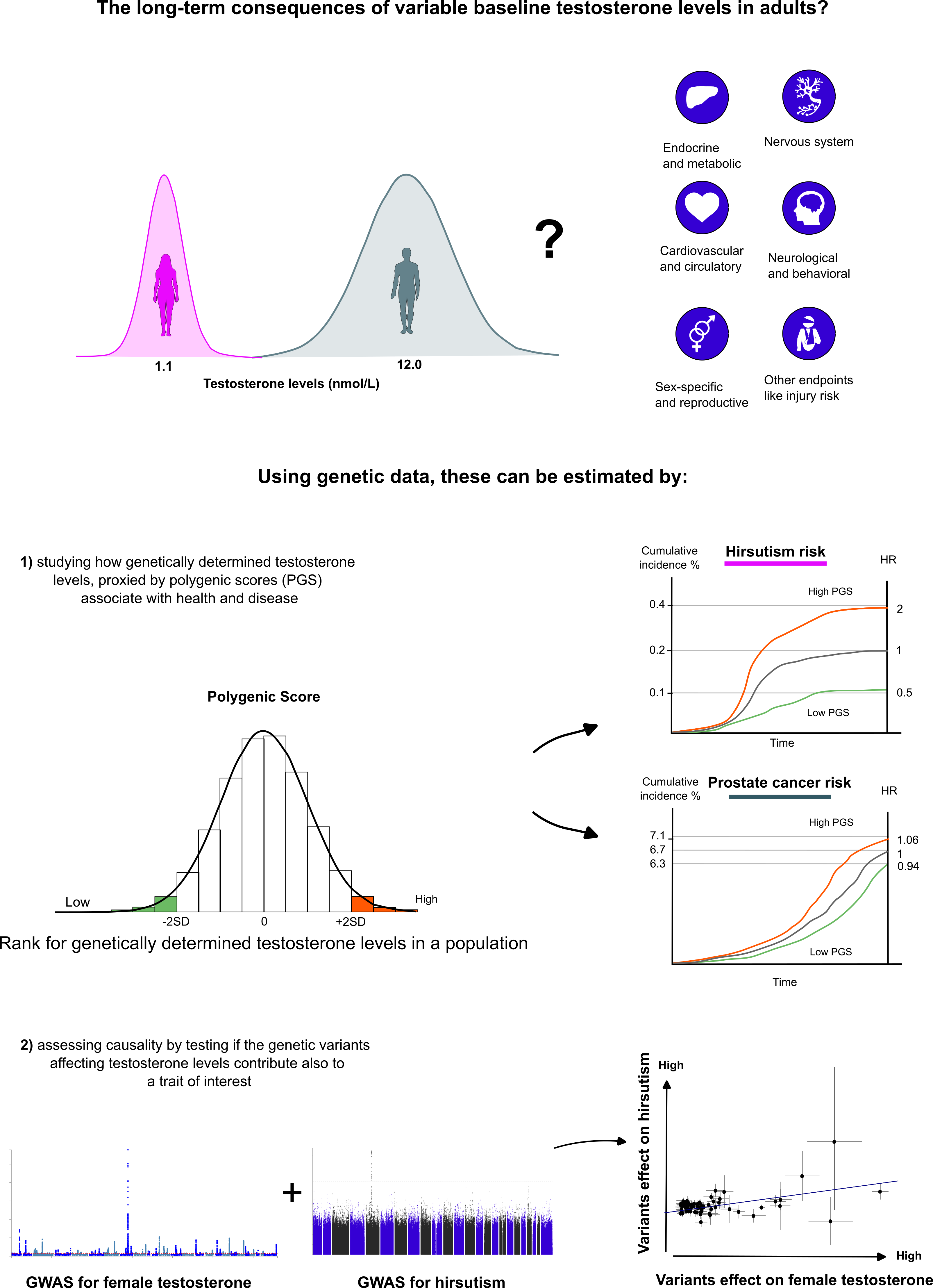 Specifically, in our study we used data from the UK Biobank and FinnGen, the first dataset containing direct testosterone measurements from almost 500,000 British participants 2, and the latter aiming to collect detailed health information from over 500,000 Finns 3,4. The UK biobank data allowed us to construct genetic instruments, polygenic scores (PGS) that we could then use to proxy the consequences of life-long testosterone exposure for the participants of the FinnGen dataset. Combining these associations with a genetic technique called Mendelian Randomization (MR), we could then directly assess the causality of testosterone levels to a wide range of human diseases and traits. In particular, the possibility to assess causality is a clear strength of genetic studies over traditional settings. Additionally, the genetic studies allow for including traits that would be unfeasible or even unethical to study in controlled clinical trials. The main concepts of our study are summarized in Figure 1.