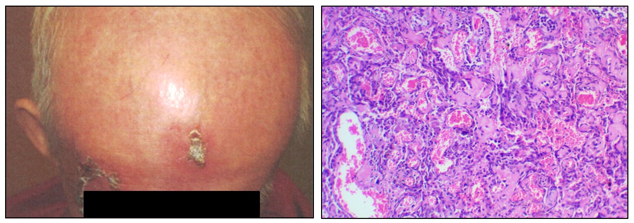 Illustration of angiosarcoma of the scalp and associated histological features