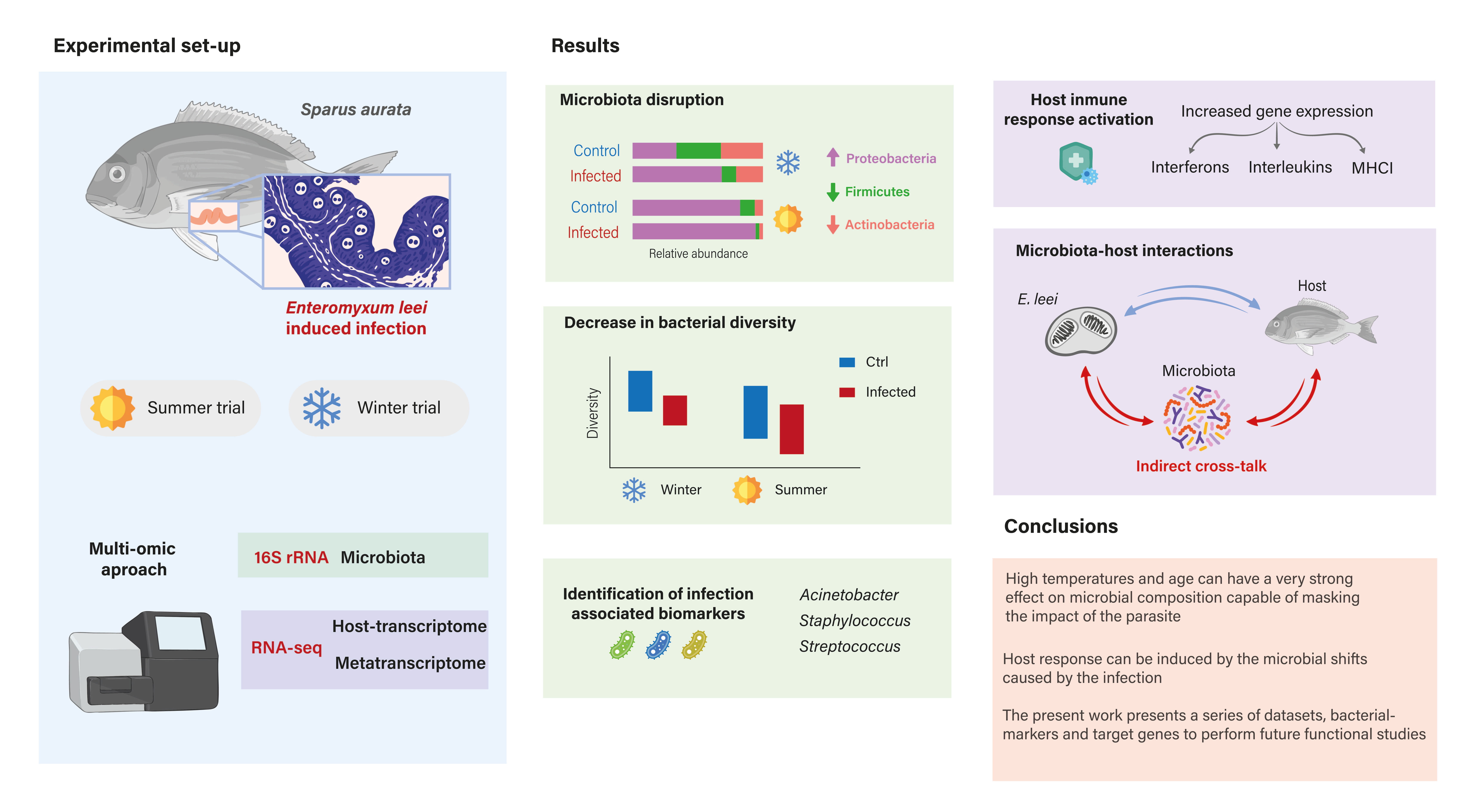 Background Gilthead seabream (Sparus aurata) is a major fish species for Mediterranean aquaculture, but its production faces challenges due to diseases. One of them is enteromyxosis, a disease caused by the intestinal parasite Enteromyxum leei. It leads to severe economic losses by reducing growth rates, triggering intestinal inflammation, and increasing mortality rates. Currently, no effective treatments exist for enteromyxosis, which makes it crucial to understand its effects on fish health and microbiota.