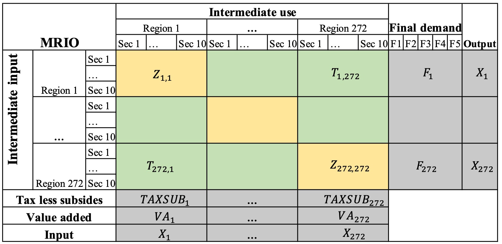 To achieve this, we start by collecting inter-country input-output (ICIO) tables and regional information, such as gross value added, gross fixed capital formation, and households' income. We then disaggregate the national marginal variables to the regional level to ensure that our aggregated multi-regional input-output tables (MRIOs) are consistent with the ICIOs. The next step is to estimate the input-output coefficients matrix based on a region’s industrial specialization. In this setting when one region employs more people in a sector than the national average, we assume that the region can either fully supply itself and/or export to other countries or regions; alternatively if its Location Quotient (LQ) is smaller than 1, the same region will need to import goods or services for this sector from other places. Next, we use regional freight transport data as a proxy for regional trade flows and apply the cross-entropy method to minimize the difference between our estimates and the proxy. The cross-entropy method is essentially a trial-and-error approach that involves generating random solutions, evaluating their performance against the proxy, and using this information to update the set of solutions we consider in the next round.