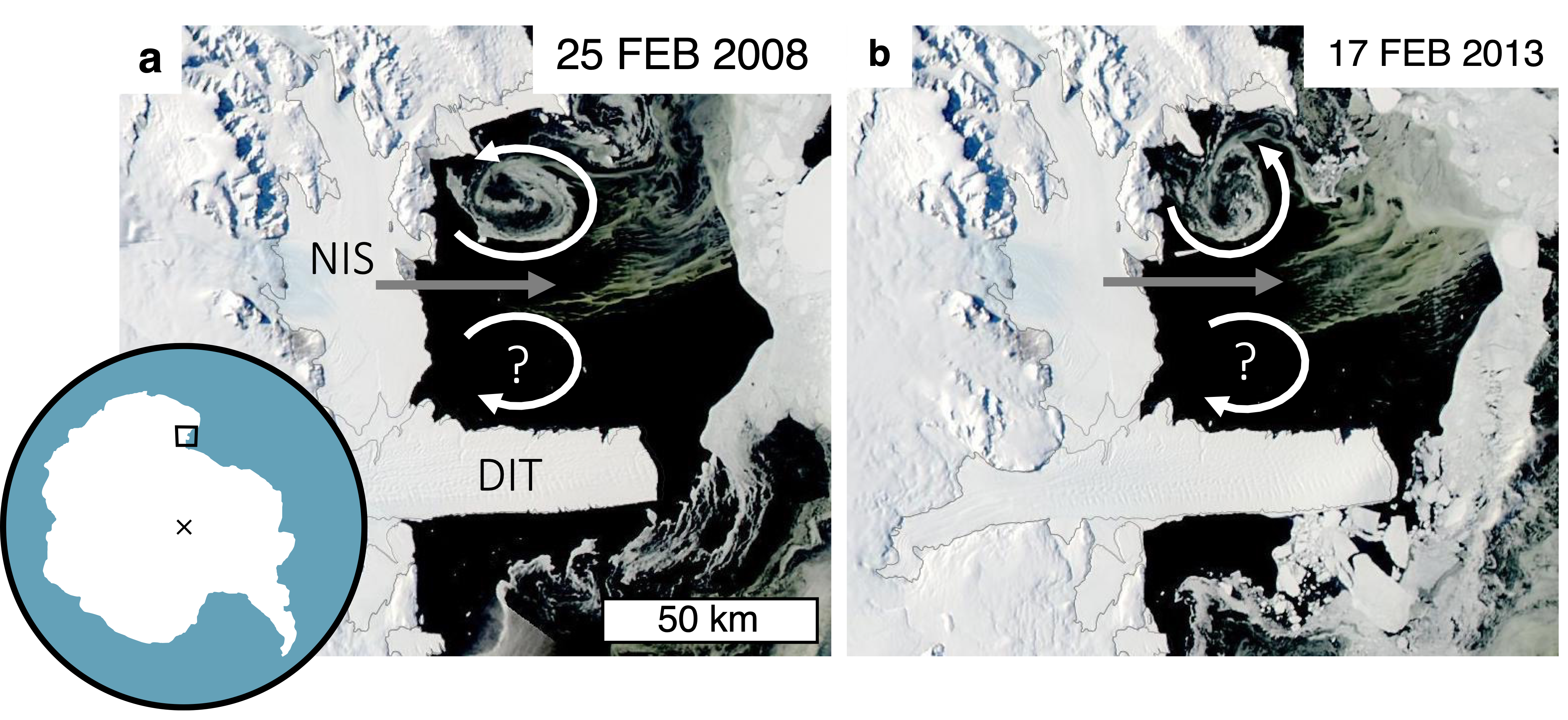 Terra Nova Bay (TNB) is a polynya, or a sea ice-free region, located in the western Ross Sea. The bay is known for its strong katabatic wind events that persistently blow down the nearby Reeves and Priestley glaciers and out over Inexpressible Island (named due to the inexpressible misery it brought members of Robert Scott’s crew that wintered there in 1912). In the wintertime, these winds help TNB rapidly produce and export sea ice, which, through brine rejection, results in the formation of some of the densest, saltiest water on the planet. In the summertime, the winds help support the existence of a pair of submesoscale ocean eddies (defined as having a diameter smaller than 50 km). These eddies have been previously identified through satellite imagery that uses sea ice as a tracer4, but until our research, their impact on the coastal ocean, namely heat transport near the NIS, has remained unstudied.