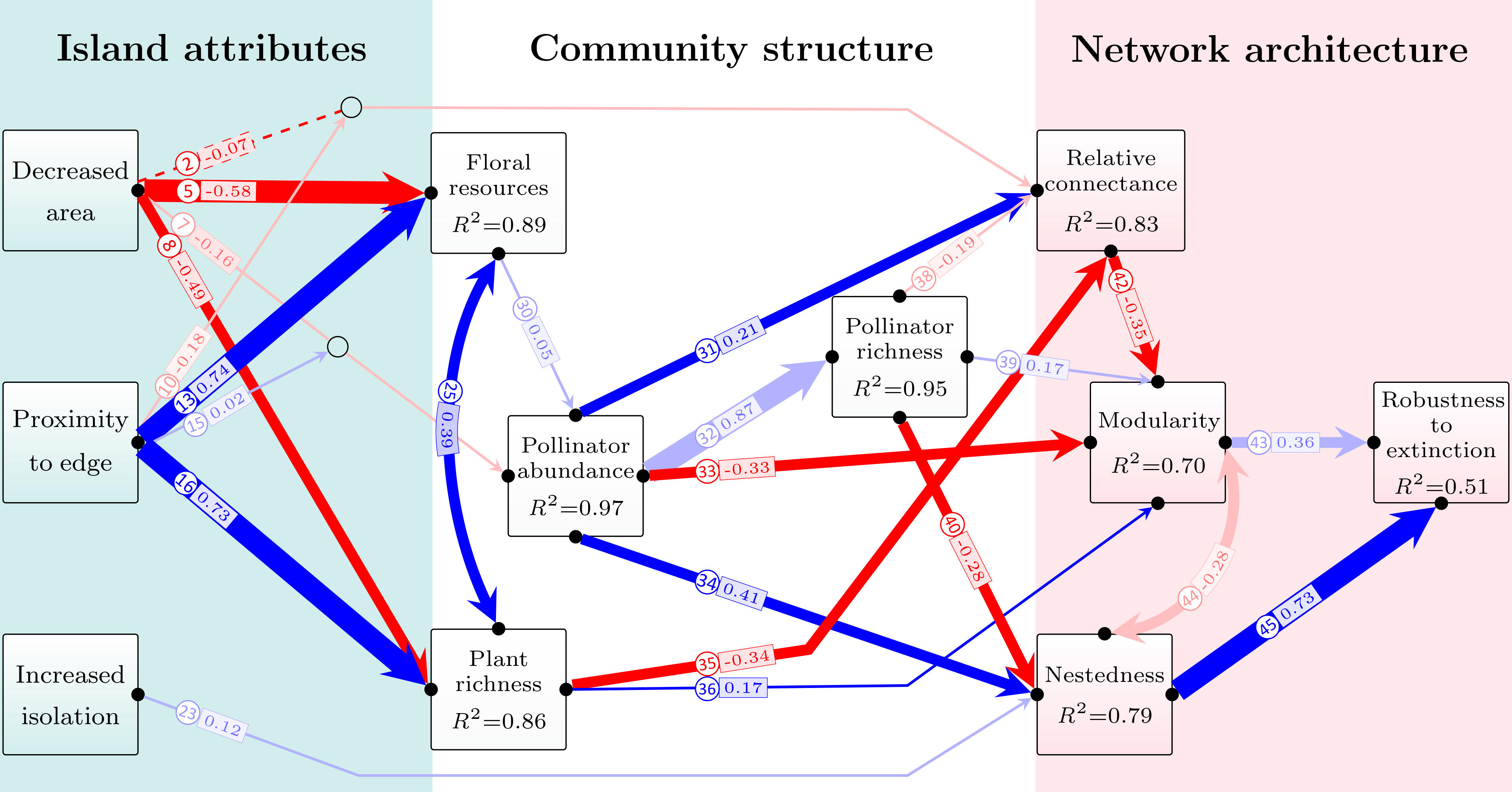 From the outset it was immediately evident that there was something very special in the results, with much higher abundance and richness of pollinators at forest edges in TIL, rather than the negative edge effects found in many other pollinator studies. Applying a structural equation modelling approach, we showed the positive impact of forest edges extended not only to biodiversity metrics, but also to plant-pollinator network structure as well. Surprisingly, despite many excellent studies applying structural equation modelling in ecology, we found there were still gaps in the available methods and the rigour of application across studies. In particular, methods to deal with incomplete sampling and stochastic sampling biases have been poorly developed in SEM studies, making it hard to judge whether the significance of causal paths is indeed an objective and credible result, or an artefact of stochastic sampling biases. After brainstorming potential standardization approaches and sensitivity tests, my discussions with Prof. Raphael gave the inspiration for explicit integration of null model resampling approaches into the SEM, which turned out to be a simple and effective approach to the problem. One important (and in hindsight quite intuitive) finding was that some causal paths with very large effect sizes in the SEM (e.g., paths 32 and 43 in Fig. 5) are not actually that ecologically important, in terms of what they tell us about fragmentation effects, because they are just what we would expect from a null ‘random’ draw from the underlying reference state or regional pool. As a result, we can clearly know which paths in the SEM are indeed causally influenced by fragmentation, over and above stochastic sampling effects and null expected relationships among variables that occur even in the absence of fragmentation.