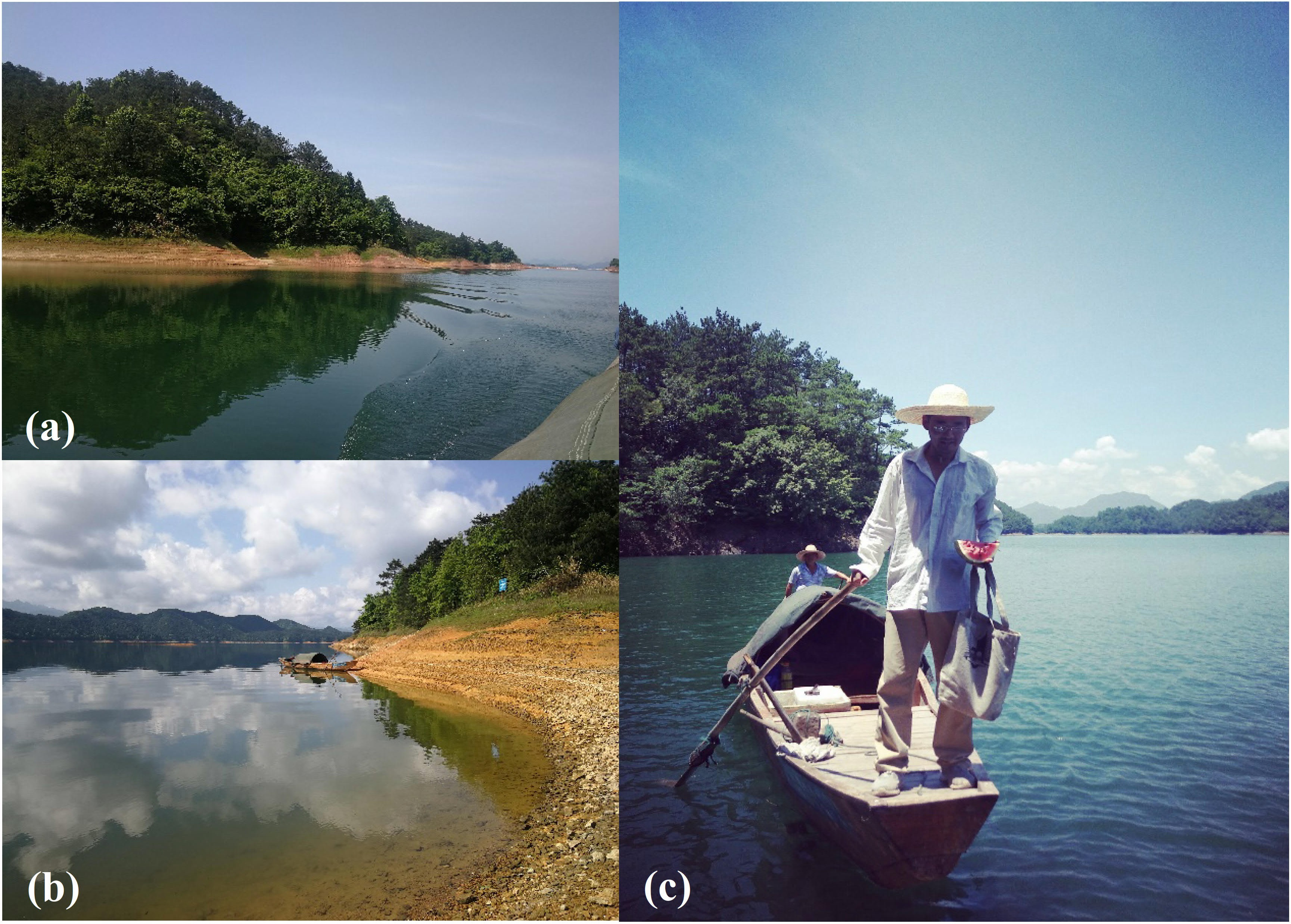 Fig. 2. Field sampling at the Thousand Island Lake. (a) On the way to the sampling sites. (b) Arriving at one of the sampling sites. (c) Returning to the field station. Photo credits: (a-b) Peng Ren and (c) Juan Liu.