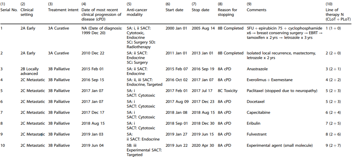 Table: The proposed standard dataset (top row) comprises the minimum data to be collected regarding the current disease status (columns 1–4) and anti-cancer therapy (columns 5–9) that would help determine the line of therapy (LoT, column 10). (Taken from Reference 1, with permission)