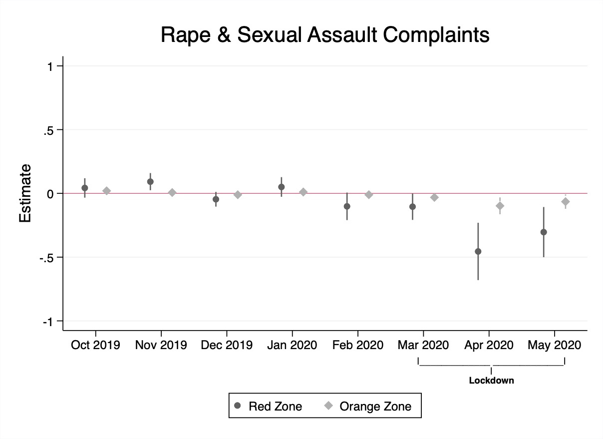 Figure 2 shows event study plots of the differential impact of red versus green zone districts in a given month relative to the monthly mean from January 2018 to September 2019, as well as analogous plots for orange versus green zone districts. We show that domestic violence complaints have increased 0.48 SD (135%) in May 2020 in districts with the strictest lockdown rules. Red zone districts also experienced a 0.71 SD (186%) increase in cybercrime complaints relative to green zone districts in May 2020. Interestingly, rape and sexual assault complaints have decreased by 0.39 SD during the same period in these same districts, consistent with decreased female mobility in public spaces, public transport, and workplaces (see for example, Borker 2018). Importantly, these results show that women face a portfolio of danger, and the same policy can improve certain types of violence outcomes while exacerbating others.