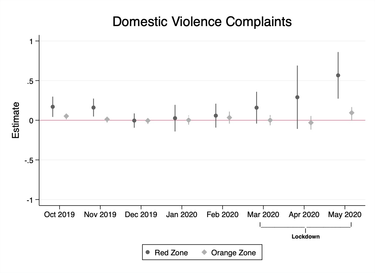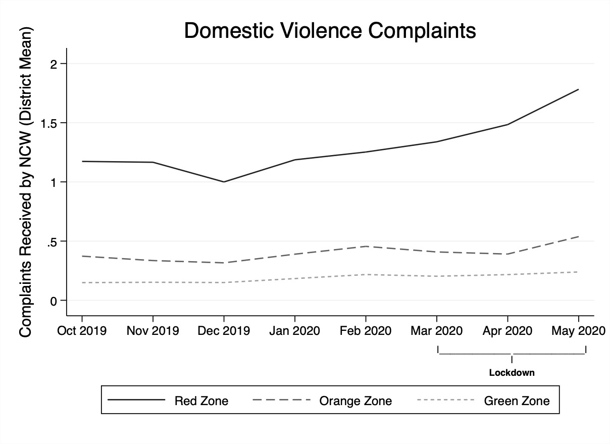 We employ a difference-in-differences empirical strategy to study the differential impact of complaints in districts most affected by the lockdown measures relative to districts least affected by the measures. In our research design, we use the classification of districts and lockdown measures by red, orange, and green zones, and show the results by month. We flexibly account for country-wide trends in complaints made to the NCW over time, using variation within a given month and year across districts, in addition to variation within a given district over time.