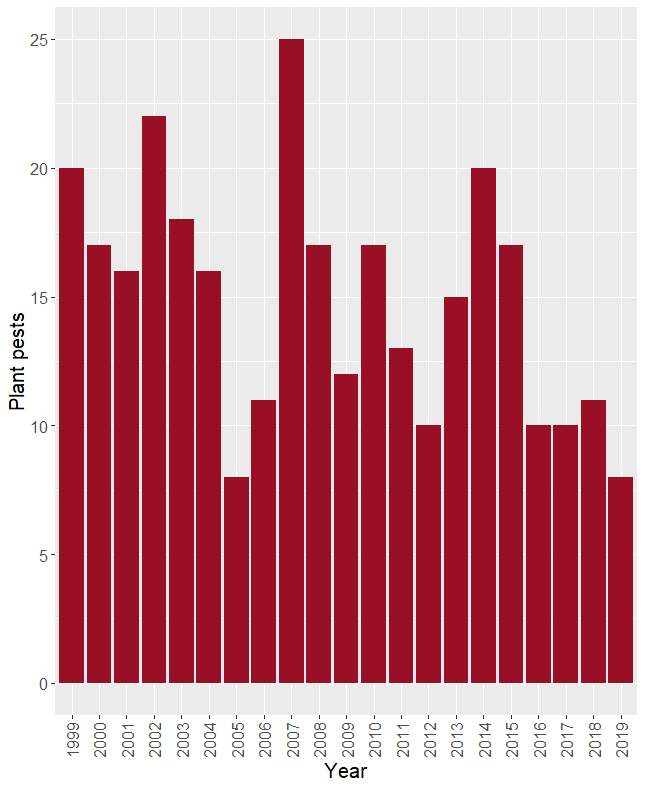 Figure 2 Bar chart showing the number of pests’ first introductions in each EU Member State per year (1999-2019).