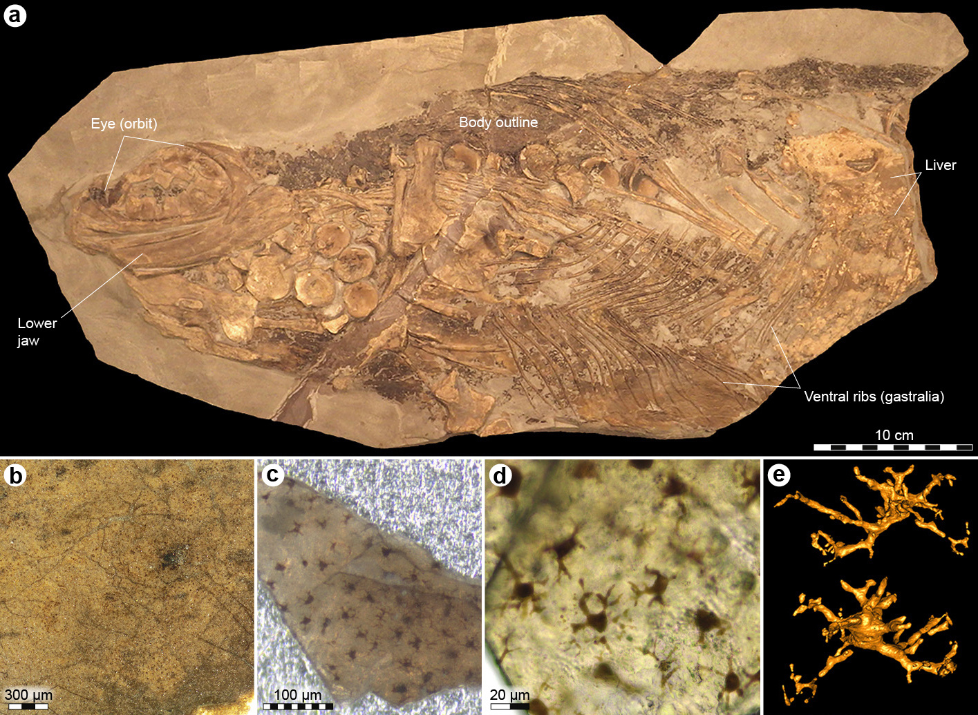 Ichthyosaur pigment cells (melanophores). a, Photograph of the anterior end of our 180-million-year-old ichthyosaur fossil (MH 432) in oblique ventral view. b, Demineralized flank integument showing multiple subsurface pigment cells (dark dots) embedded in the semi-transparent epidermis. c, Light microscopy image of epidermal melanophores embedded in phosphatic matrix. d, Enlargement of the fossilized pigment cells and their branching processes. e, SRXTM rendering of a fossil melanophore with dendritic processes.