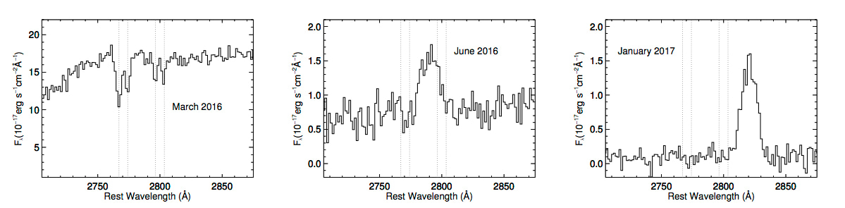 Around the wavelength where we had seen the Mg II absorptions (2800 Å), an emission line was emerging. It was clearly present in the spectra taken during May-July 2016, after which the field set. Our next spectrum, taken January 2017, showed that the emission line was still present, but had shifted to a redder wavelength by several tens of Ångstrom, going from being blueshifted to redshifted with respect to the supernova. A closer inspection of the previous spectra showed that the line centroid had been shifting systematically redder with time, it was just much more obvious over the longer time gap. What on earth was going on??