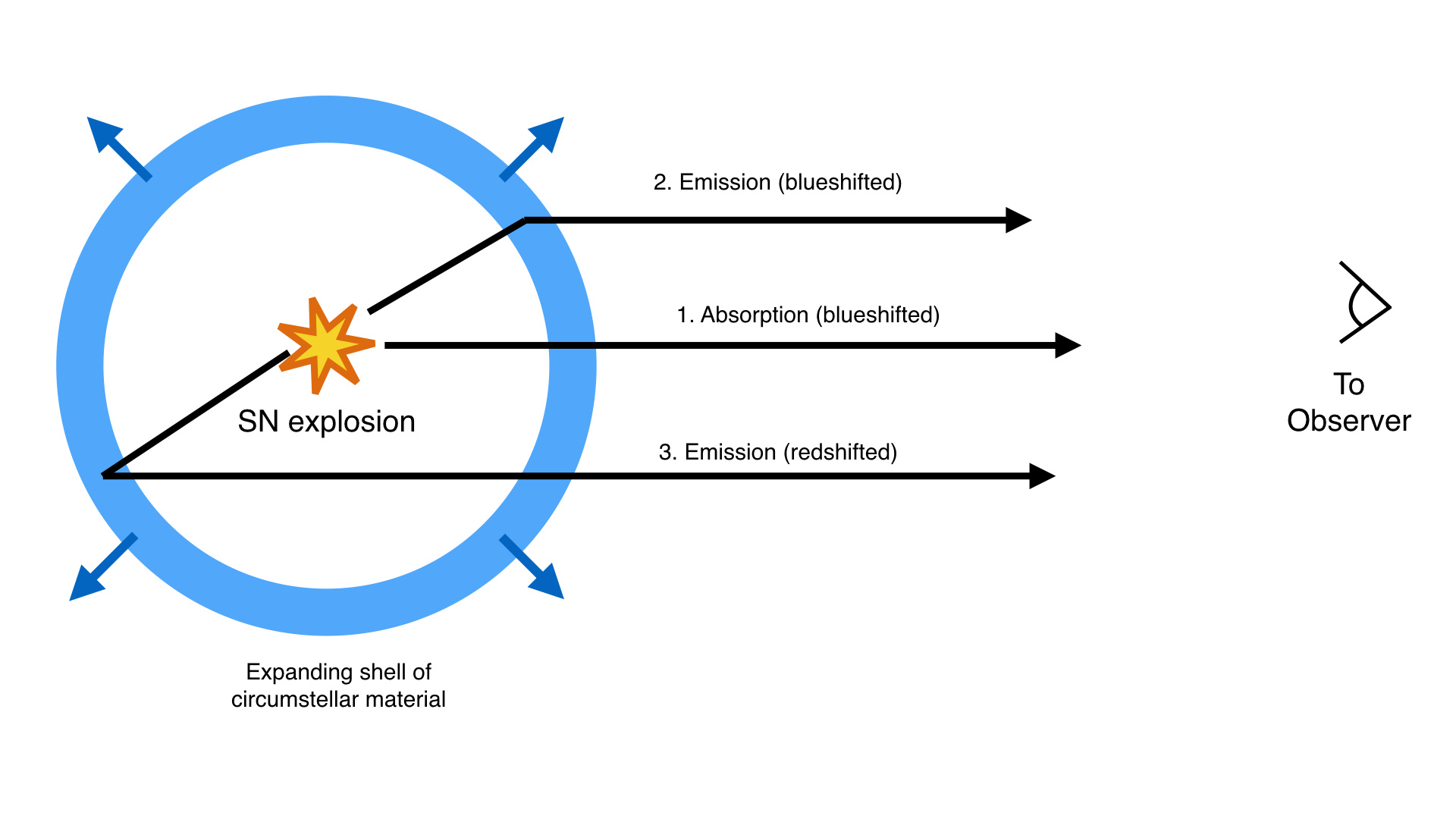 Fortunately, I happened to be visiting the Oskar Klein Centre in Stockholm when analyzing these new observations, and was able to show them to my collaborator Prof. Claes Fransson. He immediately remembered a similar effect happening in SN1987A (poster image), where light from the supernova excited atoms in a circumstellar ring, resulting in a "light echo" effect. For iPTF16eh, we realized that both the extra absorption system and the emission line must come from a fast-moving shell of material surrounding the supernova. The cartoon below describes the model we came up with: