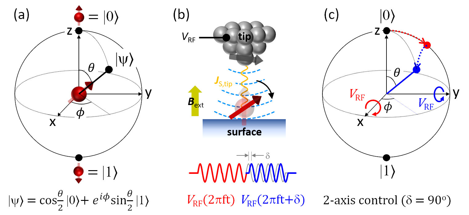Compared to a classical bit, a qubit is much more complex and has much more potential for using as information. A classical bit is always either in State |0˃ or in State |1˃, but a quantum bit can be in superposition states [Fig. 1(a)]. To control and measure the exact state of a qubit, you have to perform more elaborate operations. If you think of the qubit as a vector that’s pointing in a certain spatial direction, you should be able to set an arbitrary superposition state of the qubit vector and measure its spatial (x,y,z) components in a fully quantitative manner. In this work, we demonstrated 'single qubit universal quantum gating' of an on-surface spin using two consecutive radio-frequency pulses with a precise phase difference ('2-axis control' of a spin state [Fig. 1(c)]; see animations of its corresponding time-evolution [Fig. 2]). Our 2-axis control enabled us to access and address any quantum state of a qubit at the atomic scale.