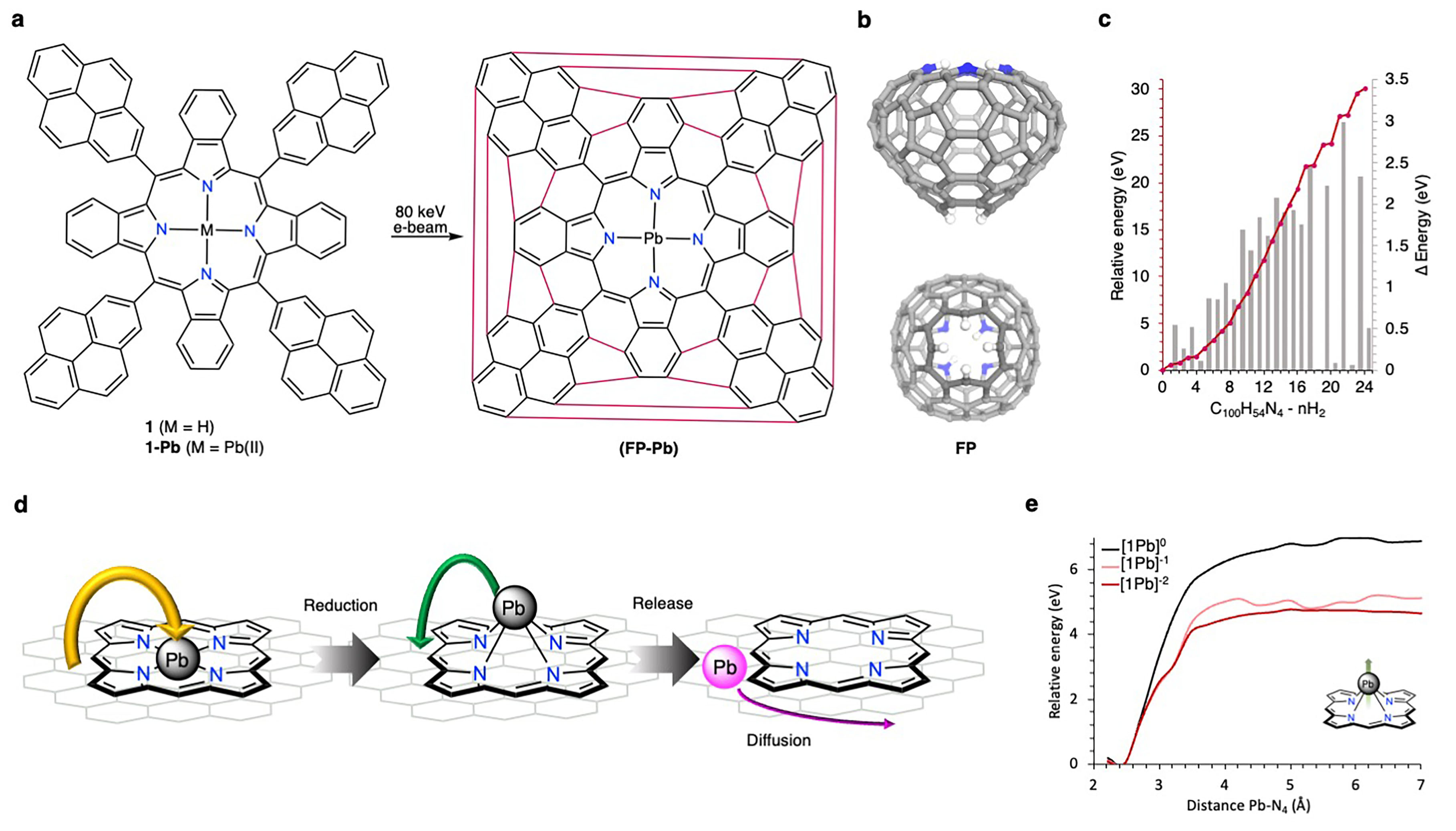 To our astonishment, instead of encountering metal-complexed precursors of 1-Pb, we observed loosely diffusing metal atoms on the surface and clusters of Pb atoms forming islands. We rationalized this intriguing phenomenon by postulating a reductive demetallation pathway instigated by the hot-electron reduction resulting from the omnipresent secondary electrons in the periphery of the electron beam, aptly named the beam-shadow (Fig. 1d). Subsequently, the reduced bond strength of the N-Pb bond as 1-Pb transitioned from1-Pb(0) to 1-Pb(-II) lead to the instant demetallation (Fig. 1e).