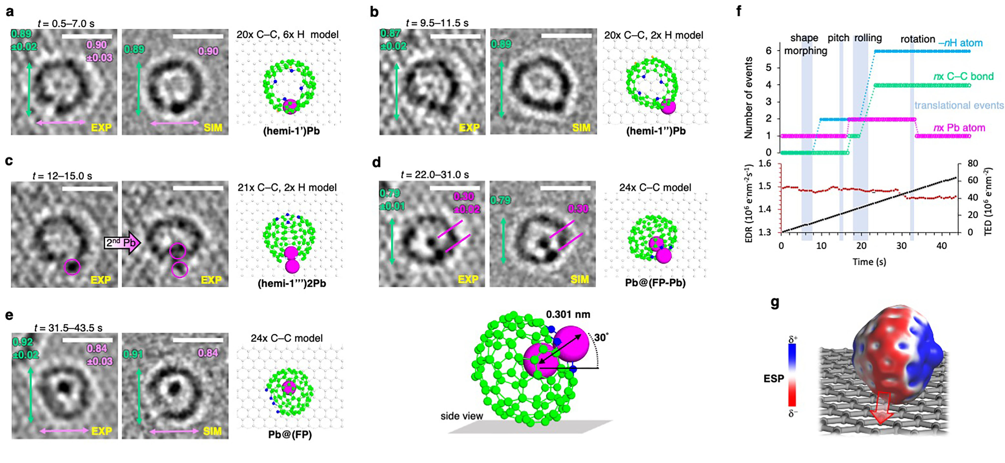 However, amidst our exploration, we encountered a remarkable intermediate structure—(hemi-1’)Pb (Fig. 2a)—that aligned flawlessly with the simulations and calculations in terms of dimensions, shape, and contrast. With the loss of four hydrogen atoms, this structure underwent further transformation, progressing into (hemi-1")Pb (Fig. 2b), which subsequently complexed a second Pb atom (Fig. 2c). After a series of additional transitions on the graphene surface, a fascinating bimetallic cage structure emerged—Pb@(FP-Pb)—with one Pb atom encapsulated within the endohedral cavity and the other complexed by the porphyrinic coordination site (Fig. 2d). Intriguingly, over time, the complexed Pb atom was decomplexed, resulting in the formation of the monometallic species Pb@(FP) (Fig. 2e).