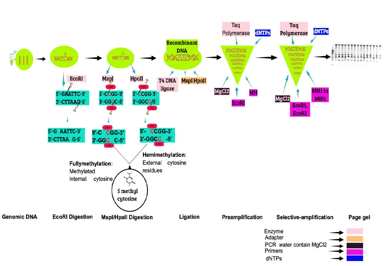 Several methods exist to analyze DNA methylation, such as MSAP, bisulphite sequencing, and others. MSAP is sensitive to specific methylation sites and involves cutting DNA with enzymes that recognize these methylation patterns (See Figure 2 and Figure 4).