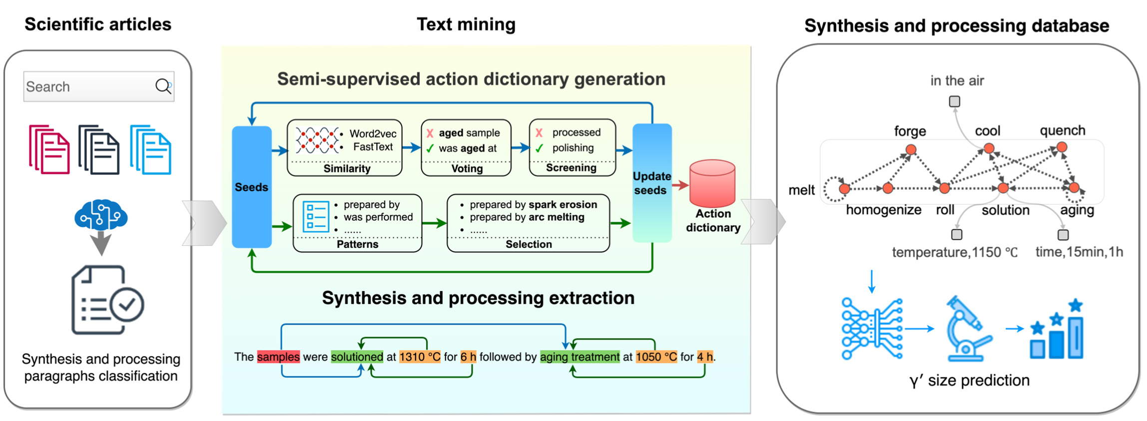 Amongst, rule-based NER and RE methods for composition/property are proposed to guarantee the precision and recall on small corpus. For synthesis and processing actions, a semi-supervised recommendation algorithm (Fig. 2) for token-level action and a multi-level bootstrapping algorithm for chunk-level actions are developed with just a limited amount of domain knowledge and human-machine interaction. Utilizing this pipeline, we obtain a machine learning available dataset containing alloy chemical composition, synthesis and processing actions and γ’ size records from a corpus of 16,604 superalloy articles published up to 2022.