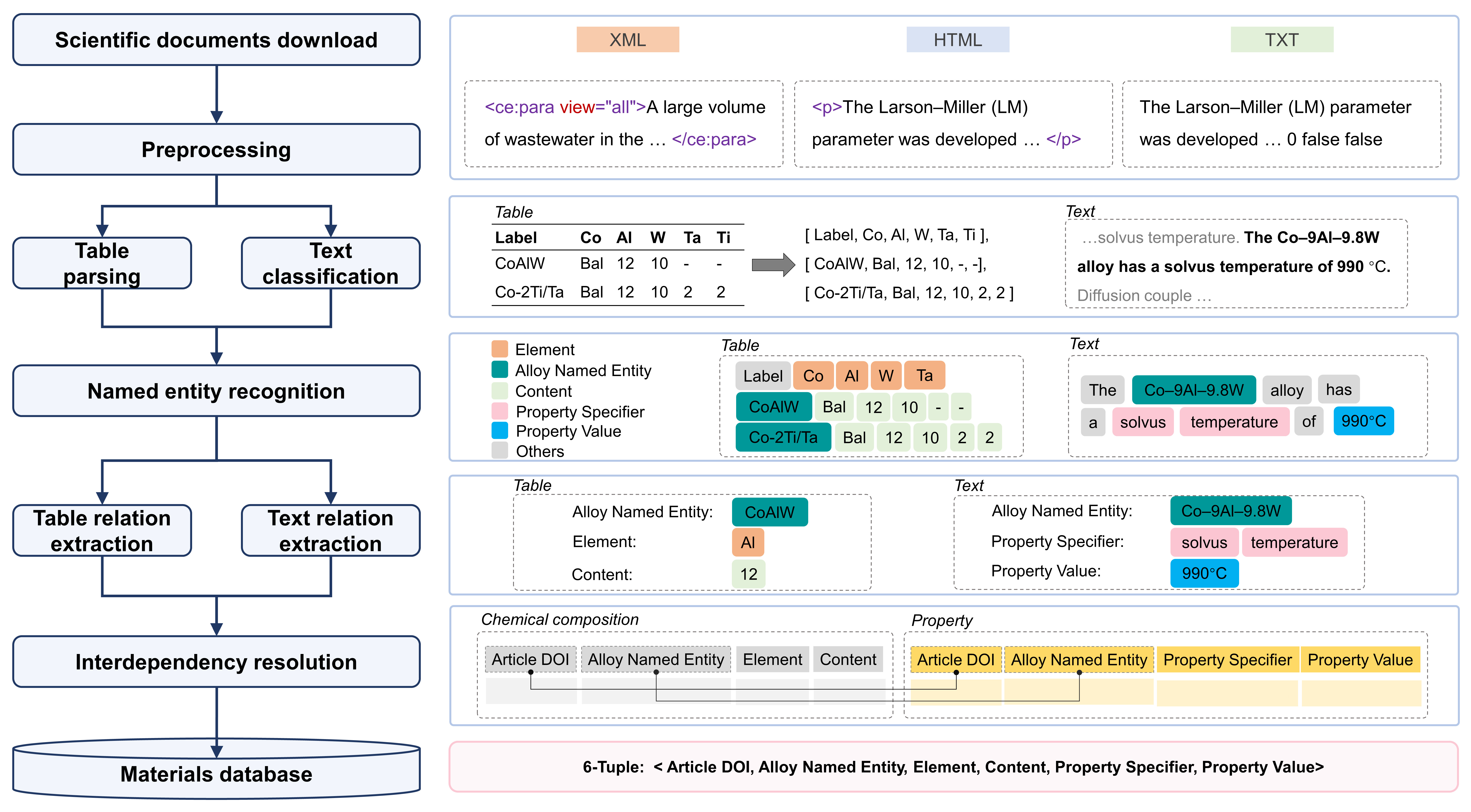 Fig. 1 Schematic workflow of the automated text mining pipeline. The workflow involves several stages of scientific documents download, preprocessing, table parsing, text classification, named entity recognition, table and text relation extraction, and interdependency resolution. A corpus of scientific articles is scraped and the irrelevant information in raw corpus is then filtered during preprocessing. According to the table parsing and text classification, the tables and sentences with target information are determined for named entity recognition and relation extraction. The alloy named entity, property specifier and property value are recognized by named entity recognition, and relation extraction of text and table gives the specific tuple relations. Interdependency resolution resolves the linkage to chemical composition and property data fragments for one specific material, and finally outputs a complete record into materials database.