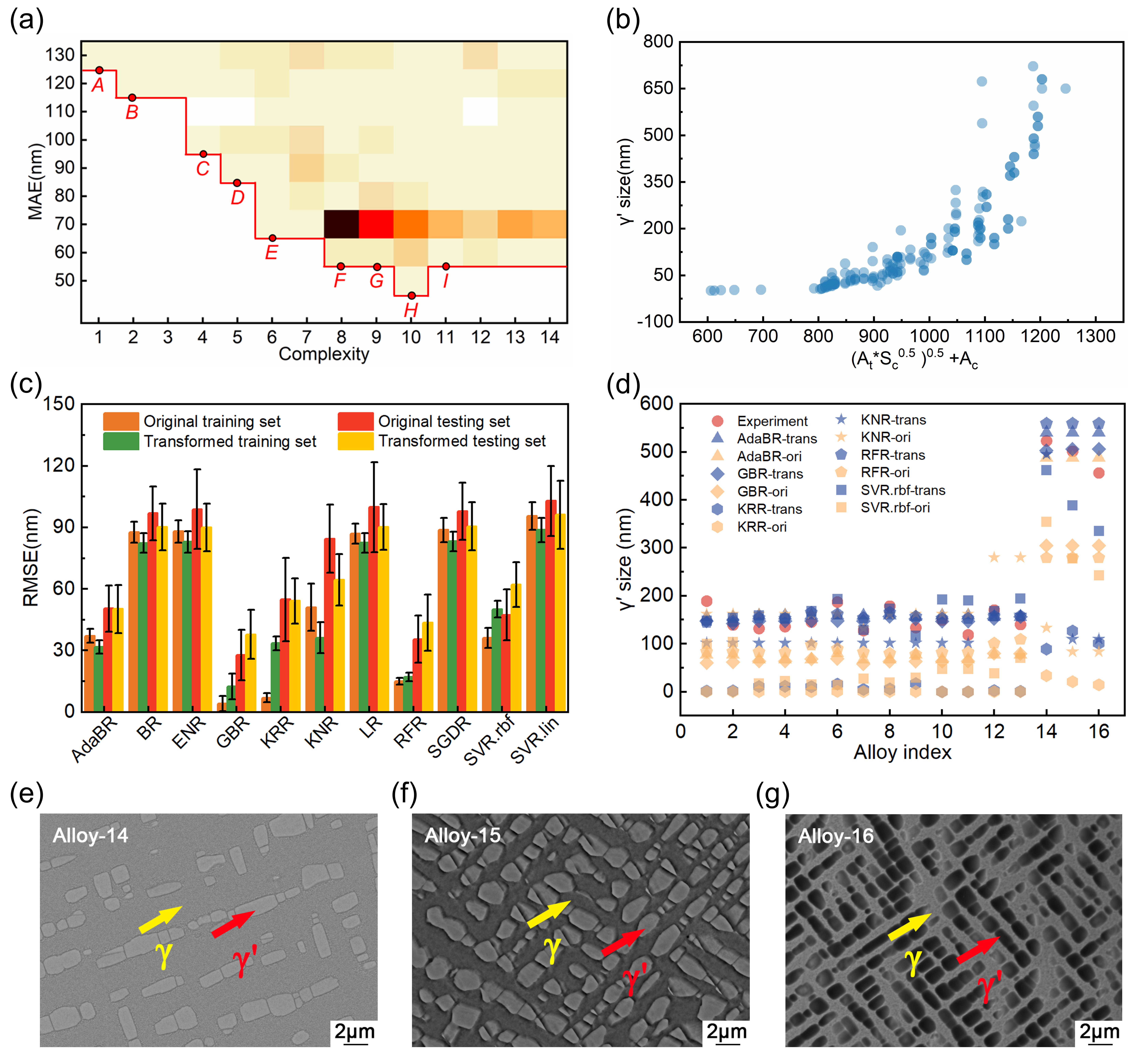 Fig. 3 The generated superalloy synthesis factor by SR which greatly improves γ′ size prediction performance. a Pareto front of MAE vs. complexity among 60,000 mathematical formulas shown via density plot. b Scatter plot of γ′ size vs (At*Sc0.5)0.5 + Ac. c RMSE for model selection under original and transformed feature space by fivefold cross validation. d The measured and predicted γ′ size of 13 superalloys newly reported in 2023 and 3 superalloys which we synthesized among all models. e The microstructure for alloy Co-29.6Ni-10.8Al-2Ti-2.5W1.6Ta-1Mo-3.5Cr. f The microstructure for alloy Co-30Ni-10.4Al-1.5Ti-1.6W-3Ta-1Mo-4.9Cr. g The microstructure for alloy Co-29.9Ni-10.4Al-1.9Ti1W-3.3Ta-1.1Mo-5.2Cr-0.8Re.