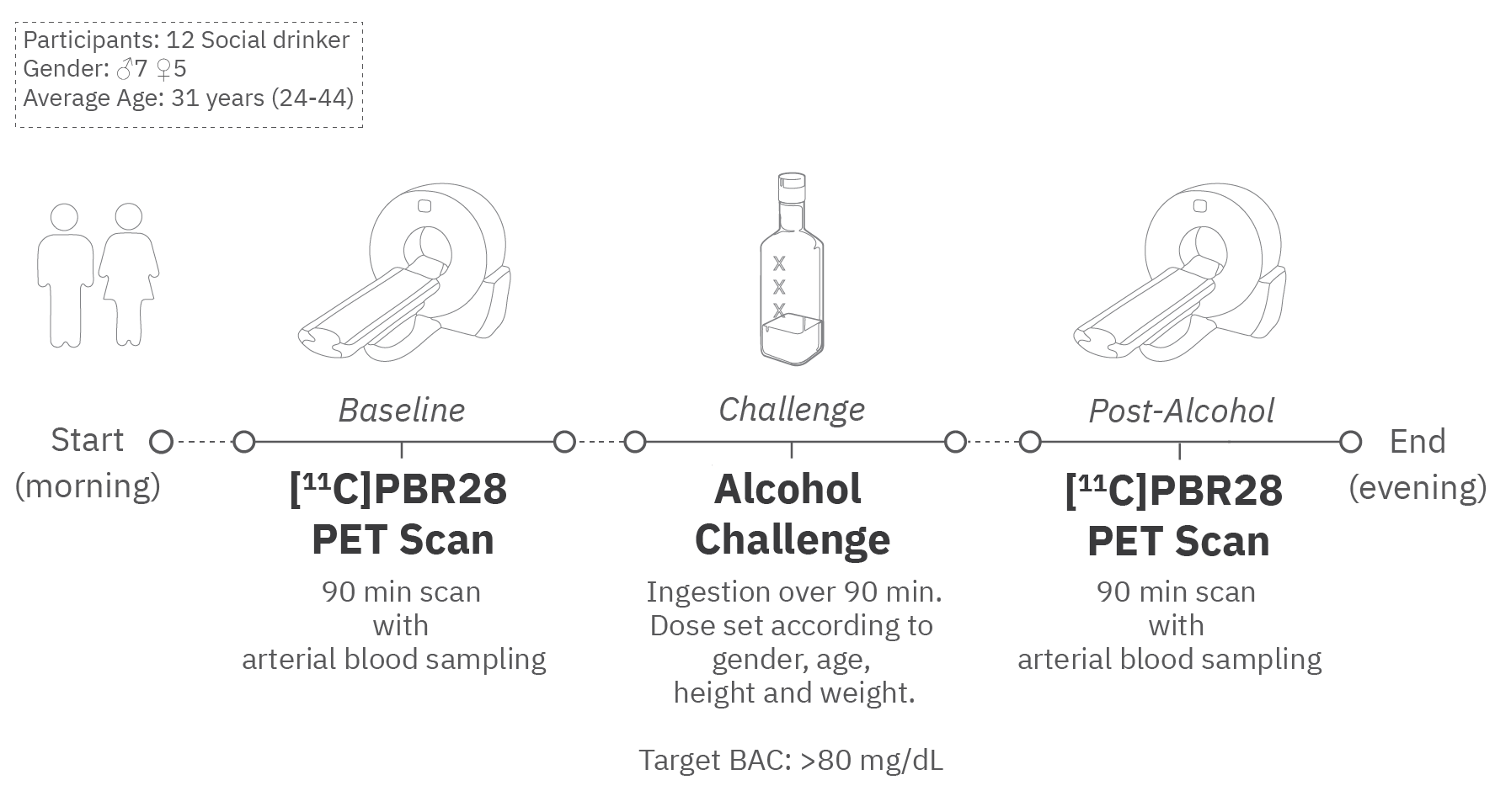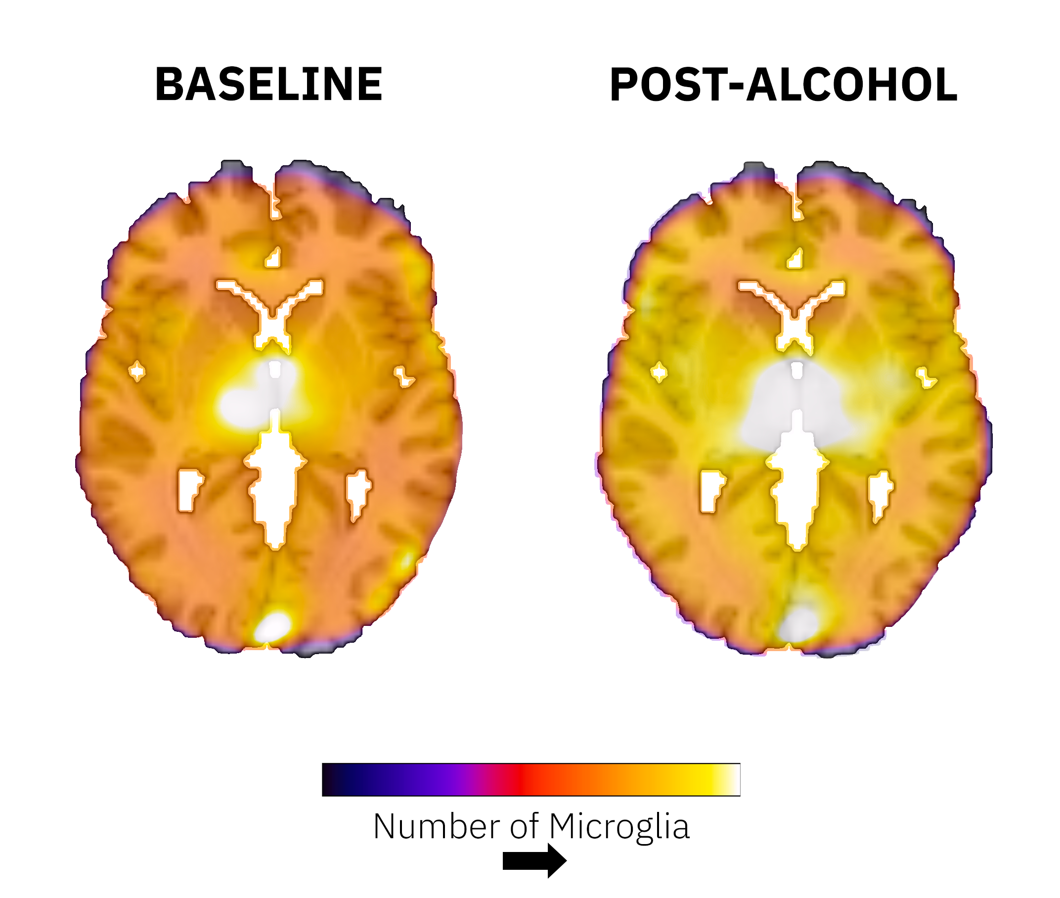 Our research journey sought to illuminate this unexplored domain, employing positron emission tomography (PET) with a radiotracer, [11C]PBR28. This tracer is known to target the 18-kDa translocator protein, a marker of microglia number that is responsive to immune challenges[4-5]. While our endeavor was meticulously structured, it was not exempt from obstacles. Each participant embarked on a day-long data acquisition marathon in the research scanner. The day started with a baseline scan, followed by a lunch break. Then came the binge drinking session, featuring four to five cocktails not exactly in vogue in 2023: 80-proof vodka mixed with a decarbonated, non-caffeinated, and non-caloric drink. This was followed by another scan and a seemingly endless stream of questionnaires.