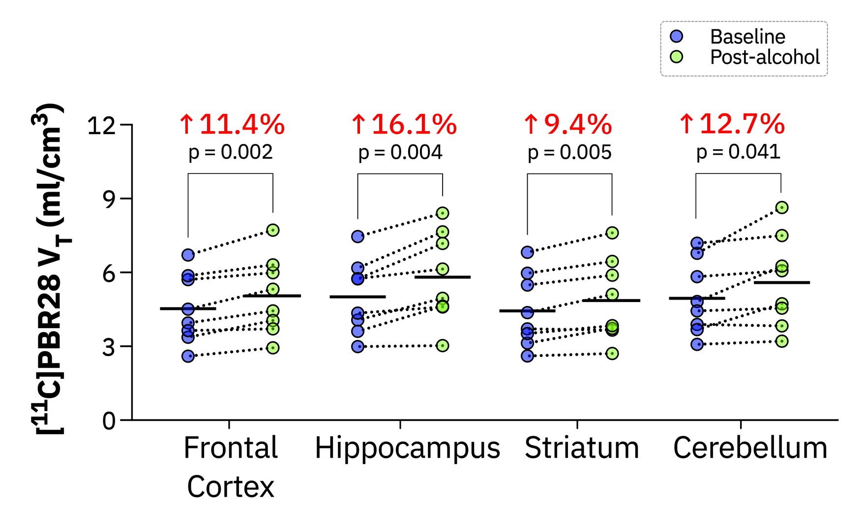 As we navigated these difficulties, we were rewarded with moments of revelation that sparked a sense of wonder. Our data unveiled a profound and global response in the brain's neuroimmune system across all participants following a binge drinking episode. This was a surprising outcome. While we anticipated a response based on rodent[6] non-human primate data[7], the extent of the response was more dramatic than we had expected. These novel findings present an exciting leap forward in the field of neuroscience. The neuroimmune system, a somewhat nebulous entity, came into sharper focus with our discovery. We found that a significant increase in neuroimmune activity could occur after just one session of binge drinking - a fact that many people had not considered. This revelation could have profound implications for future research, suggesting that blood alcohol levels might be an important factor to consider when scanning individuals for neuroimmune markers.