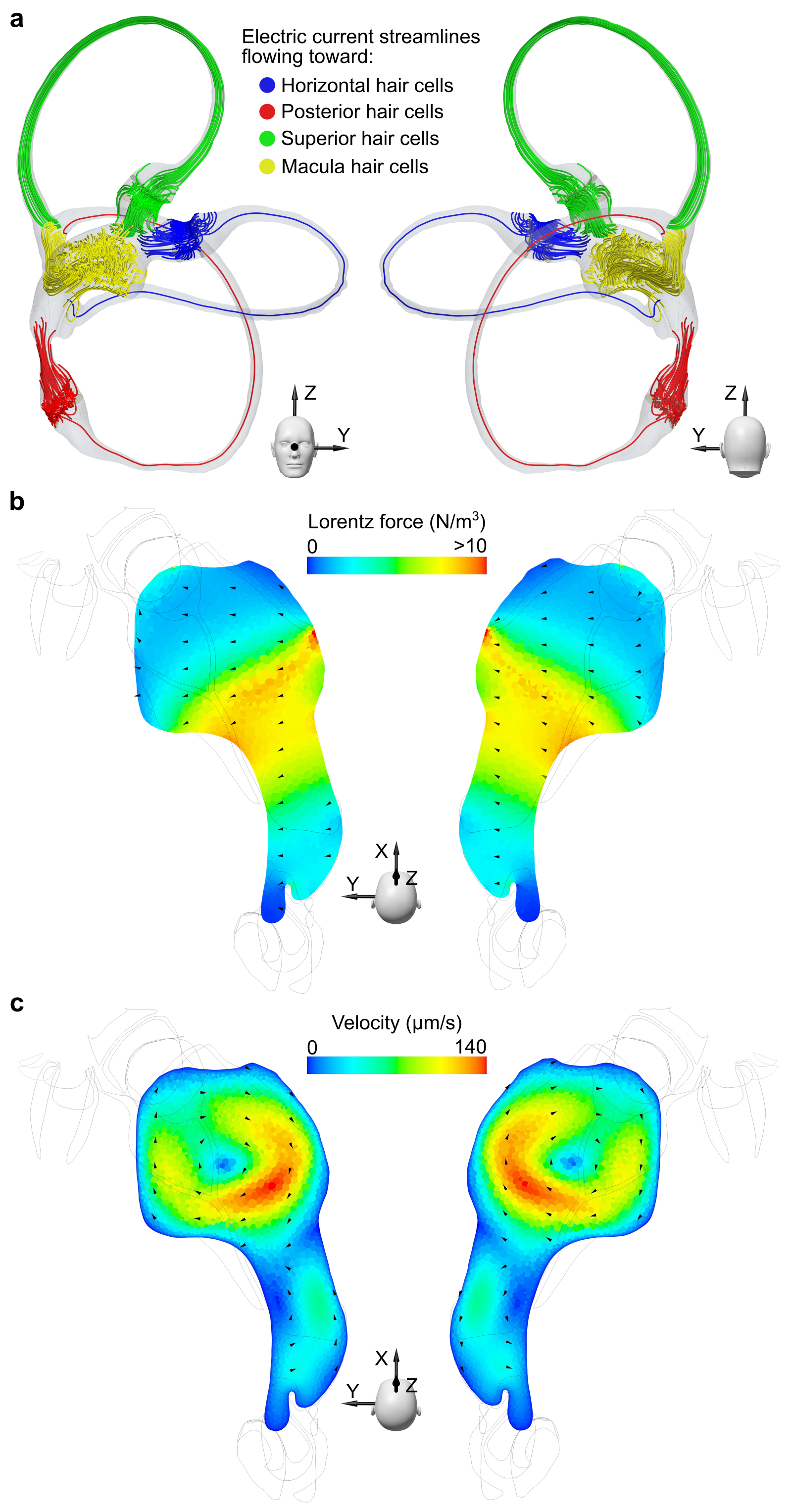 Researchers from the University of Santiago de Compostela, the University of California, and Johns Hopkins University have developed a groundbreaking model to explain the dizziness and nausea some patients experience during high-field MRI scans. The model integrates fluid dynamics, solid mechanics, and electromagnetism equations to accurately represent the complex biomechanics of the vestibular system. Their study reveals that the strong static magnetic field interacts with tiny electrical currents in the inner ear, generating a Lorentz force that displaces the inner ear fluid (Figure 1). This subtle fluid shift stimulates the vestibular system—the part of the body responsible for maintaining balance.