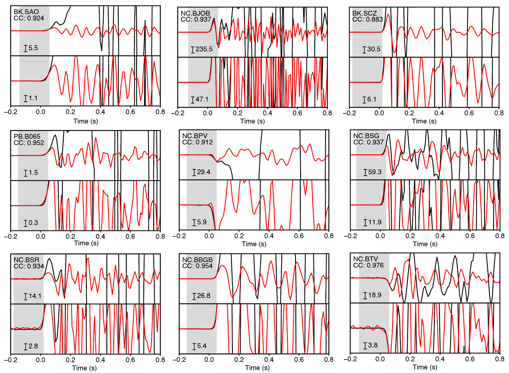 Figure 1. Example waveforms comparing seismograms of a large (black) and a small (red) earthquake.