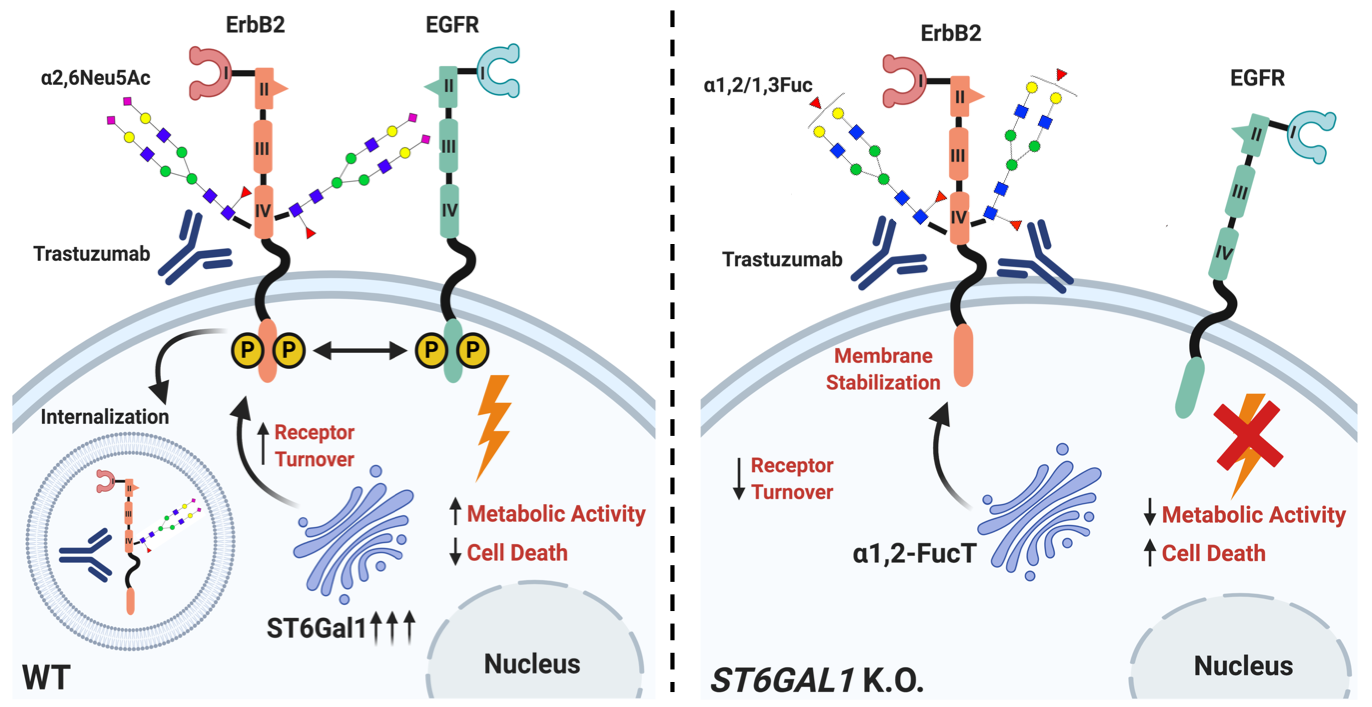In this study, we have comprehensively characterized the structural N-glycosylation profile of ErbB2’s extracellular region. Interestingly, we came across a highly diverse and site-specific glycosylation landscape, in which complex and, in particular, terminally α2,6-sialylated N-glycan chains are restricted to two glycosylation sites occurring within the receptor’s trastuzumab-binding domain. Furthermore, we were able to confirm the expression of ErbB2 sialylated glycoforms in gastric carcinoma clinical specimens, thus validating ErbB2 as an in vivo carrier of cancer-associated sialic acid motifs. The terminal α2,6-sialylation of N-glycans is solely catalyzed by the ST6Gal1 Golgi-residing sialyltransferase, which is widely overexpressed in multiple epithelial cancers. By abrogating the activity of the ST6Gal1 enzyme in ErbB2-driven GC cells, we observed a drastic reshaping of the ErbB2 glycome, in which terminally sialylated glycans are selectively replaced by multi-fucosylated species, specifically at the trastuzumab-binding domain. ST6GAL1 K.O. sensitized ErbB2-addicted GC cells to trastuzumab-induced cytotoxicity, by reducing the receptor’s membrane turnover rate, stabilizing ErbB2-containing oligomers at the cell surface, and reducing ErbB2 and EGFR intracytoplasmic phosphorylation.