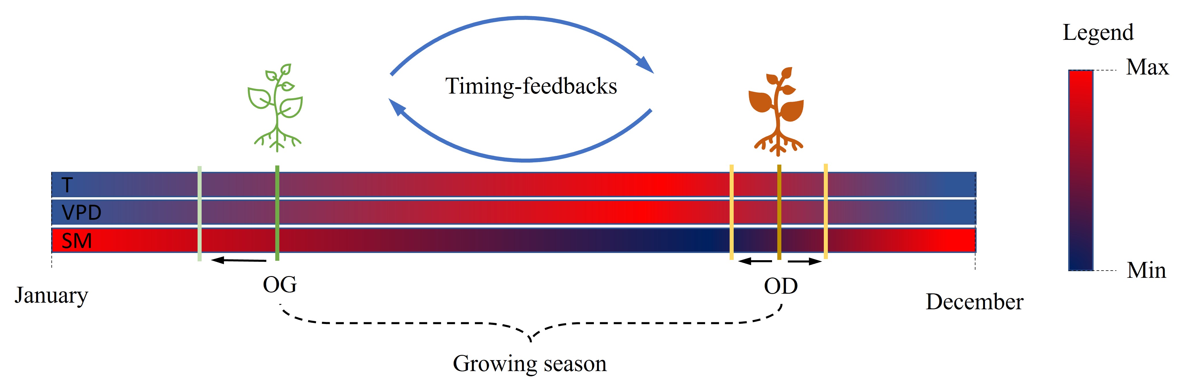 Figure 1 | Schematic representation of the effects of climate change on the occurrence of onset of greening (OG) and dormancy (OD) that determine growing season length (GSL). It shows the effect of increased temperature (T) in spring on early OG and the effect of increased T in summer on increased vapor pressure deficit (VPD) and decreased soil moisture (SM) and consequently on OD.
