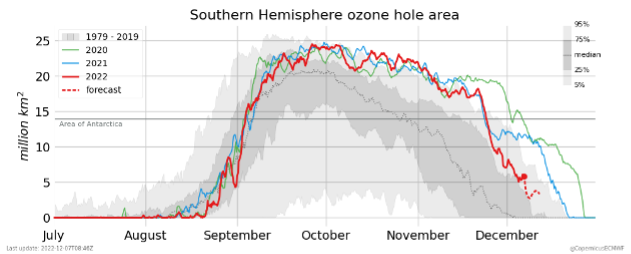 Fig. 1 | Daily area of the 2020-2022 Antarctic ozone holes, shown in comparison to the 1979-2019 median from Copernicus (Credit: https://atmosphere.copernicus.eu/copernicus-unusually-persistent-antarctic-ozone-holes-2020-2022)