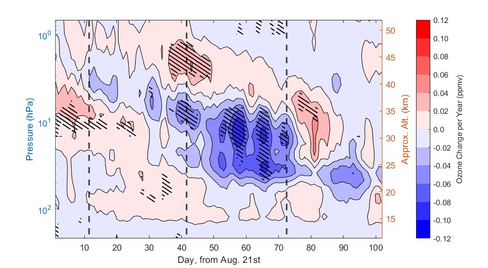 Fig. 3 | Change in daily, zonally averaged polar (75°S–82°S) ozone concentration (VMR) from MLS/Aura satellite observations, from Aug. 21st to Nov. 30th. Black vertical lines indicate separation between months. Red indicates where ozone has increased since 2004, while blue shows where ozone has continued to decline since 2004.