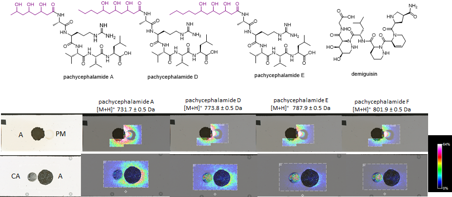 Bottom: MALDI Imaging showing a co-culture of Amycolatopsis sp. PS_44_ISF1 (A) and Pseudomonas monteilii (PM), and Candida albicans (CA). Intensity of molecular ion features of pachycephalamides are visualized and show an uneven distribution [picture credit @Anna Komor and Elena Seibel]