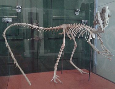 Figure 1. Fossil of one of the feet of Santanaraptor (left, picture provided by R. Delcourt) and a skeleton reconstruction of Santanaraptor in the National Museum of Brazil (source: Wikipedia).