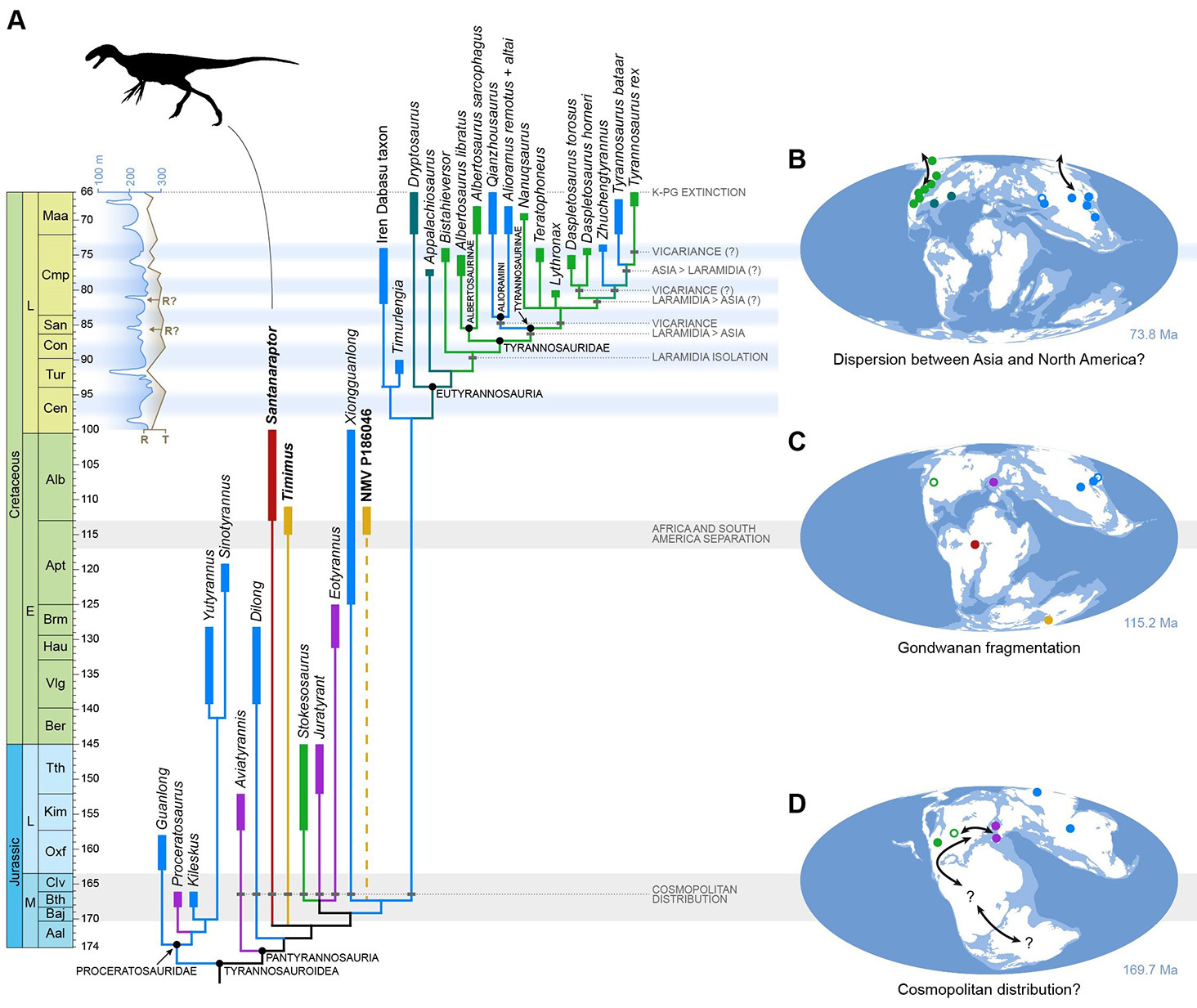 When Santanaraptor was alive, South America did not have a direct land connection (or at a least permanent one) to the northern continents. Tracing back in time the evolutionary lineage that leads to Santanaraptor and its closest relatives, the authors estimated that those lineages diverged several million years before the time of Santanaraptor, back in the Middle Jurassic. At that point in time, all major landmasses comprising the two major continents of Gondwana and Laurasia were closer together. Therefore, they proposed that tyrannosauroids could be distributed worldwide by the end of the Jurassic, explaining how they reached down to South America, and possibly Australia.