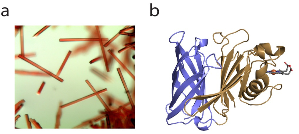 Figure 1: Crystals (a) and X-ray structure (b) of HphA (PDB 7RED). Heme is shown in stick form bound to the N-terminus.