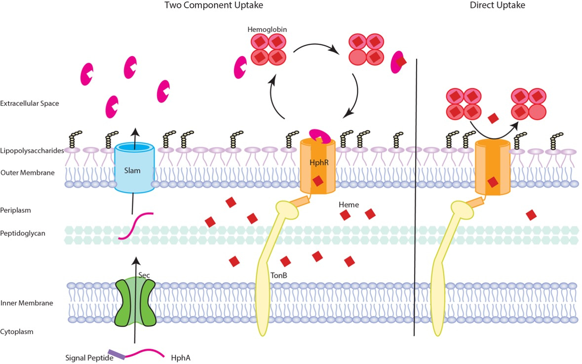Figure 2: Schematic of heme acquisition by the Slam gene cluster. Briefly, HphA is secreted into the environment by Slam, where it pirates host heme and delivers it to the TonB dependent receptor, HphR, for transport across the outer membrane and into the cell. Alternatively, HphR acquires heme on its own, although this process is less efficient. Details can be found in the article linked below.