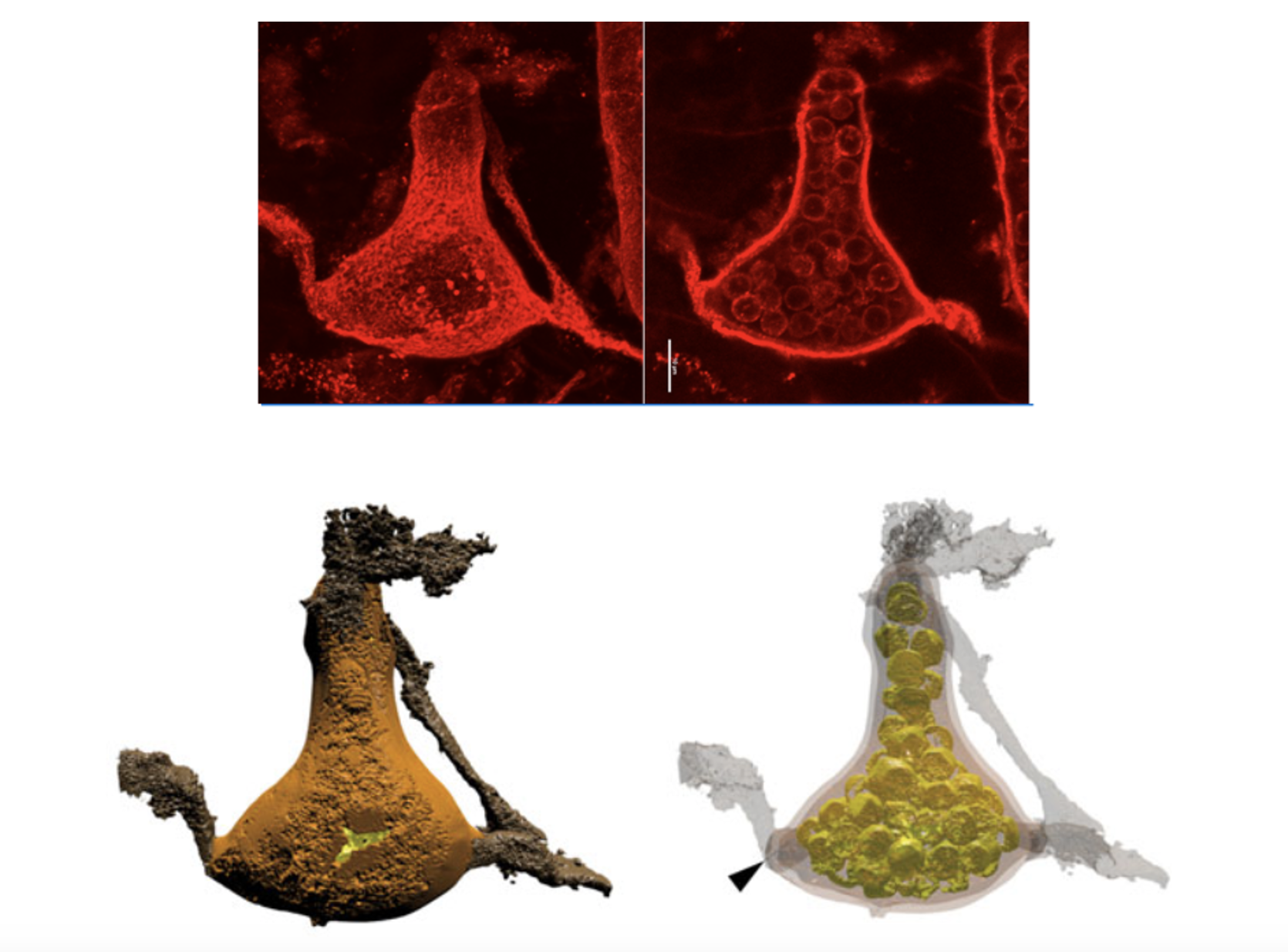 Retesporangicus lyonii, a zoosporic fungus. Confocal scanner scaning images and three-dimensional reconstructions of zoosporangia using SPIERSedit and SPIERSview (from: Strullu-Derrien et al., 2018. Philosophical Transactions of the Royal Society B 373: 20170146. doi.org/10.6084/m9)