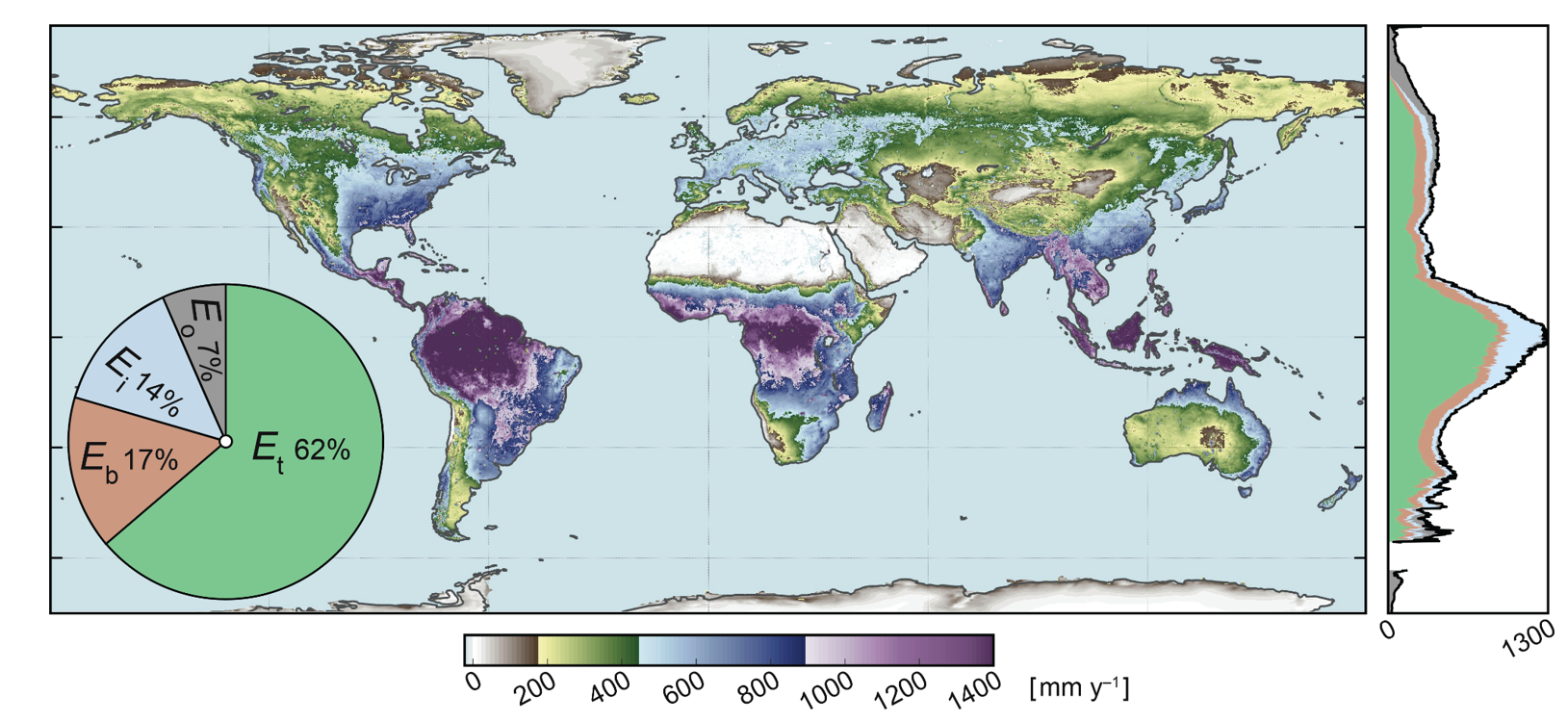 Long-term (1980–2023) mean terrestrial evaporation (E, mm y-1). The global decomposition of its component fluxes is shown in the pie diagram and the latitudinal profile on the right.