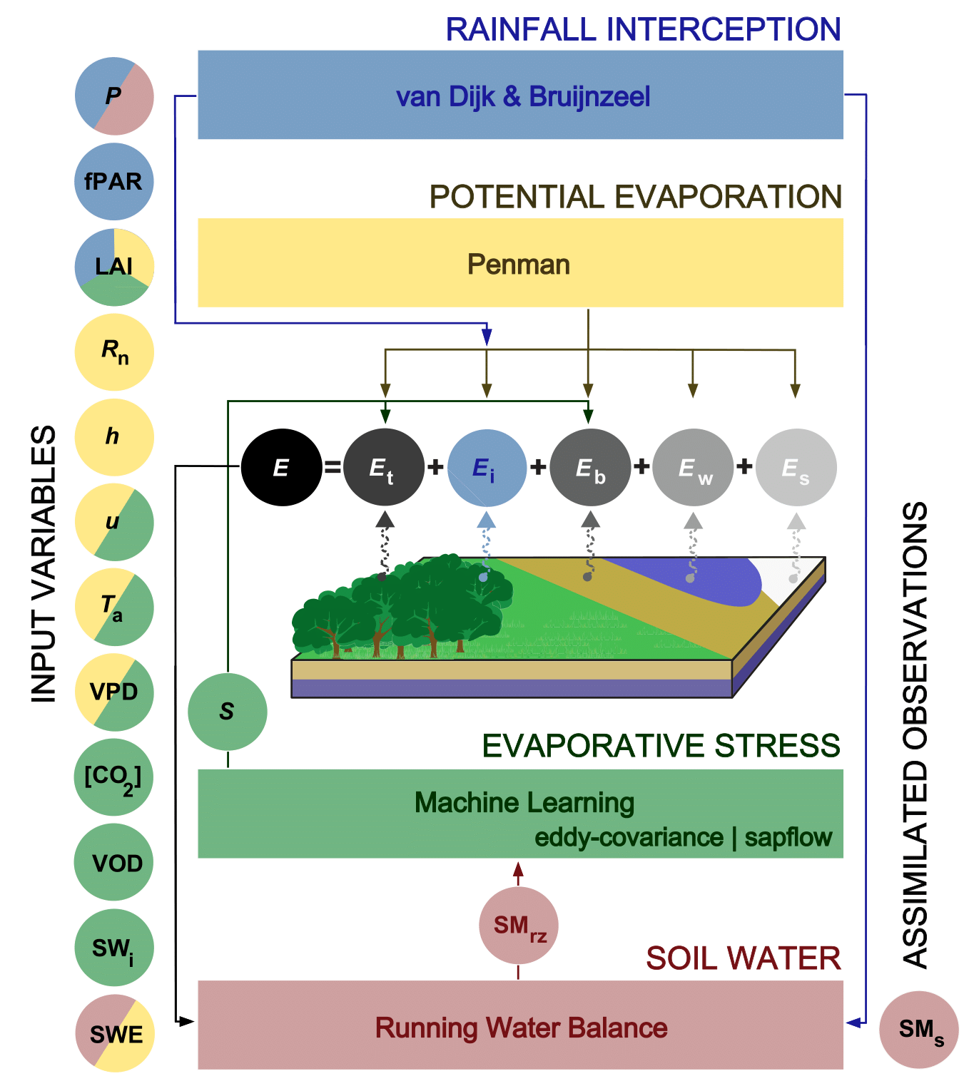 GLEAM4 follows a modular approach to estimate evaporation (and its components) as outlined in Figure 1.