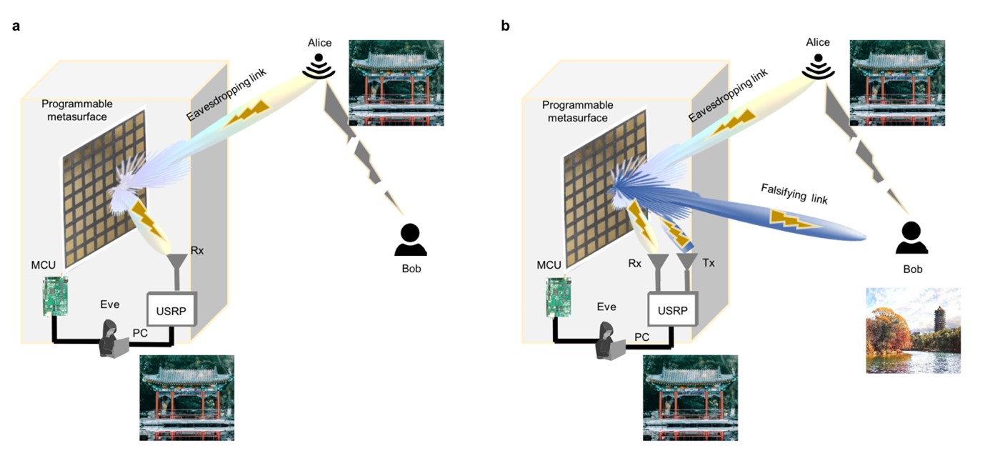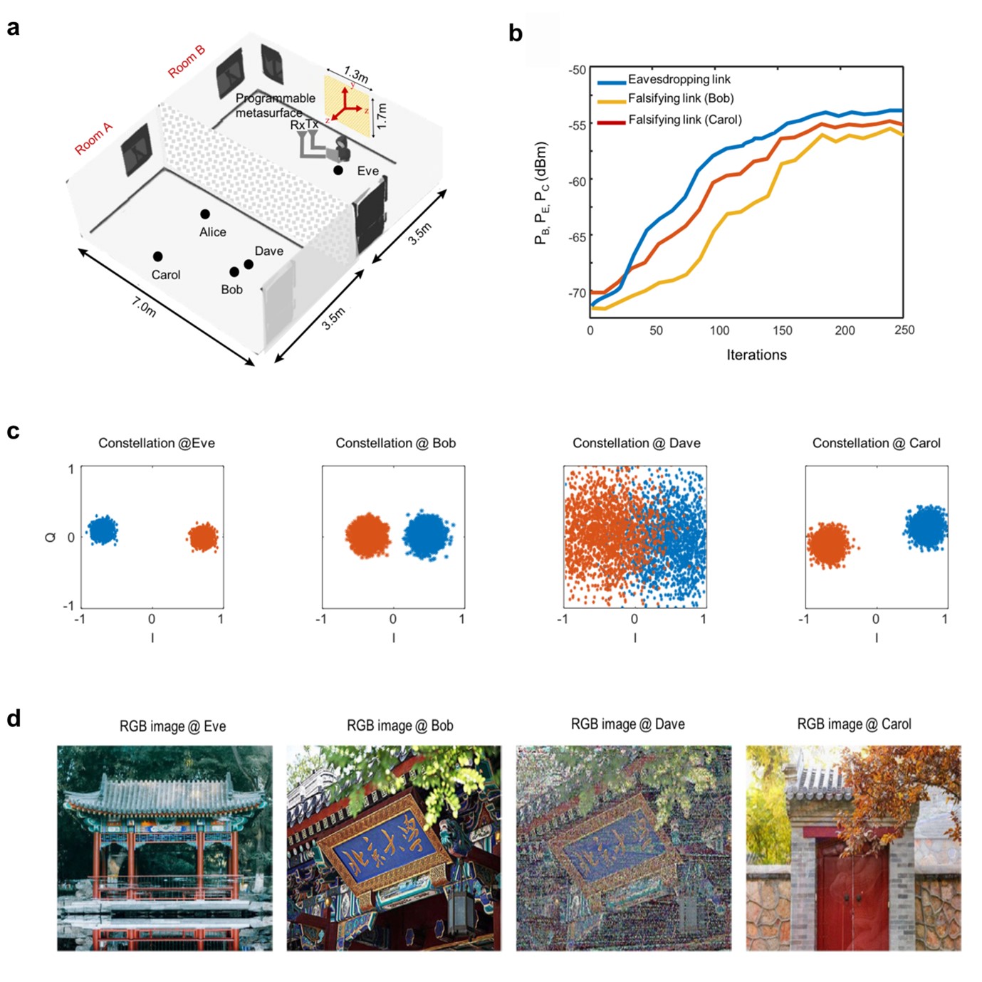 Figure 2a depicts the experimental setup where Eve, located in room B, aims to eavesdrop on and falsify information intended for Bob and Carol from Alice, located in room A. The goal is for Eve to remain undetectable to a potential detector named Dave. Using a programmable metasurface, Eve establishes independent falsifying links with Bob and Carol, transmitting deceptive data streams to them. For these latter, the metasurface utilizes a modulated backscattering wireless communication scheme, which was recently introduced by some of us [Nature Communications 11, 3926 2020, Nature Electronics 4, 218, 2021], allowing the encoding of deceptive data directly into the programmable metasurface. This enables the generation and manipulation of independent information-carrying radiation beams towards Bob, Carol, and Eve while minimizing Eve's detectability. An optimization process iteratively refines the metasurface coding pattern. Figure 2b shows the power levels of eavesdropping and falsifying at Eve's, Bob's, and Carol's sides during the optimization iterations. Figure 2c displays some typical constellation diagrams (for binary phase-shift keying modulation) of the received signals at Bob's, Eve's, Dave's, and Carol's sides, showing significantly degraded signal quality at Dave's side. Furthermore, assuming the transmission of an RGB image from Alice to Bob, Figure 2d illustrates Eve's ability to eavesdrop and falsify images received by Bob and Carol, while the image received by Dave is of notably lower quality. Further details and additional results can be found in the accompanying video: