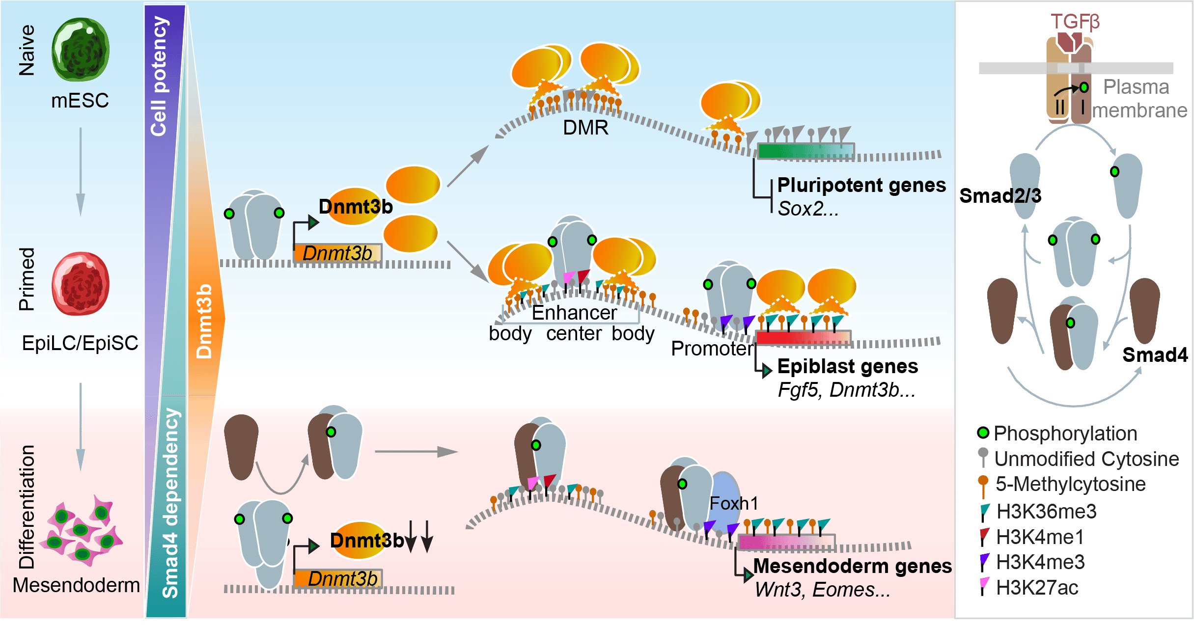 - Naïve-to-Primed Transition: Smad2/3 upregulates Dnmt3b independently of Smad4, which establishes proper DNA methylation patterns, and enables Smad2/3 binding to the epiblast marker genes.