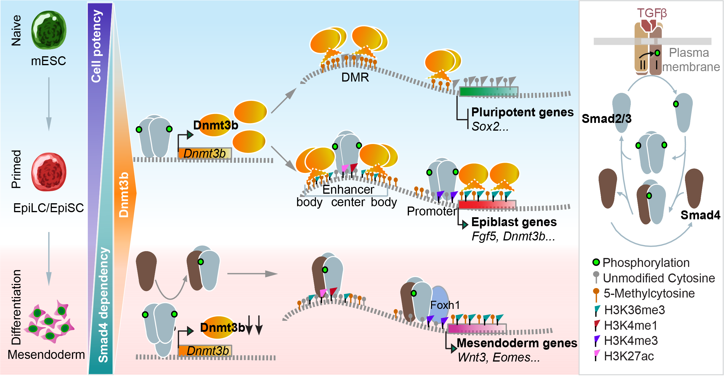 - Mesendoderm Differentiation: Dnmt3b becomes less actively engaged in global genome methylation, and Smad4 steps in to collaborate with Smad2/3, forming the canonical Smad complex necessary for mesendoderm lineage commitment.