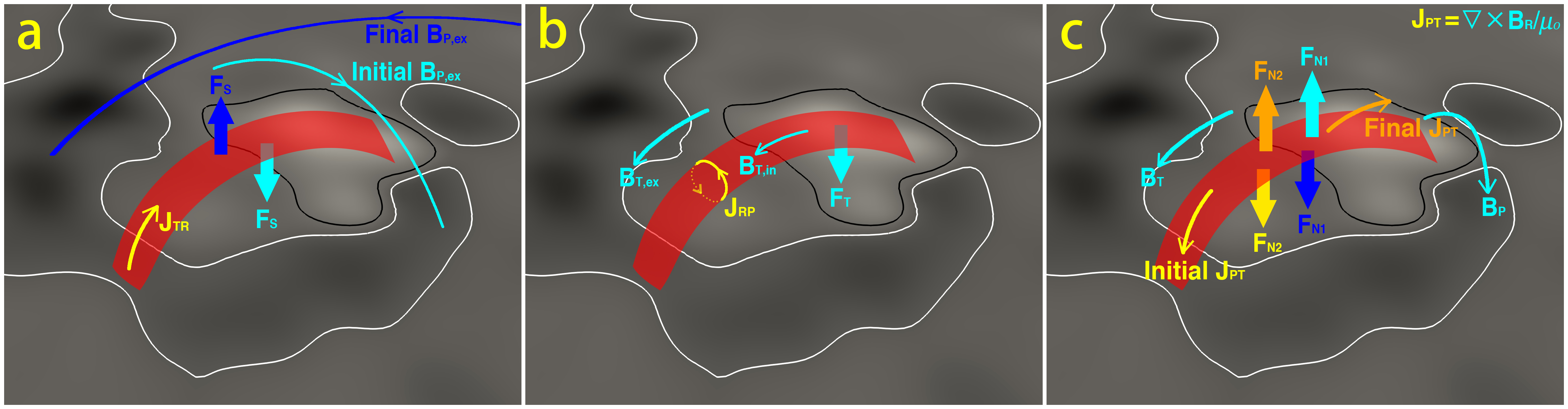 We find that a force component, resulting from the radial magnetic field of the flux rope, can also prevent the flux rope from successful eruption (Fig. 2). This force component has never been included in previous models. Note that the radial field distorts the cross section and leads to a non-axisymmetry of the flux rope. Since real flux ropes are more or less non-axisymmetric, such a force should not be neglected in predicting the eruption behavior.