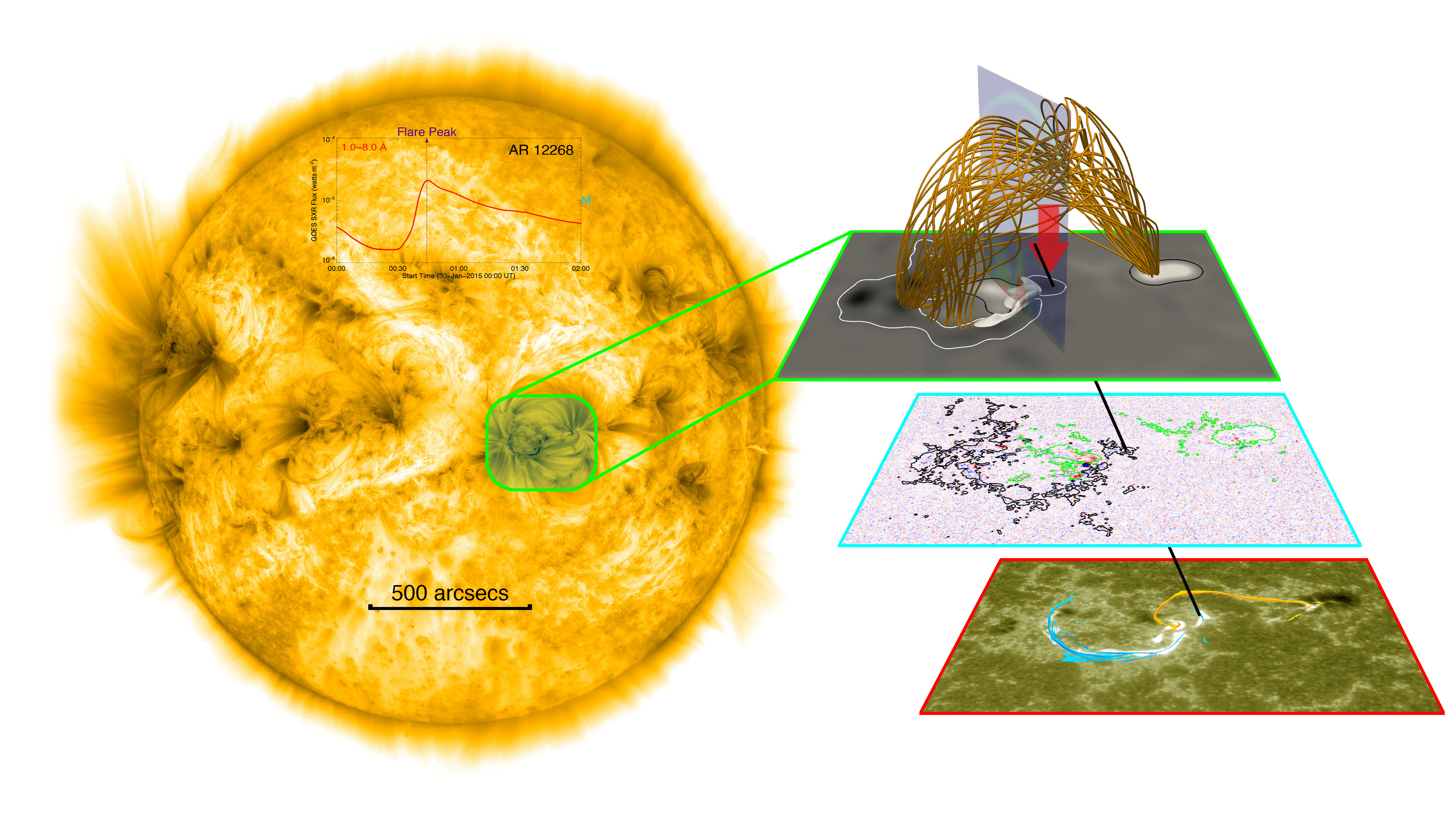 Motivated by the above thoughts, the Solar Physics Group at Nanjing University, including Ze Zhong (Ph. D. student), Yang Guo and myself, initiated a project investigating the causes of failed solar eruptions. To this end, we have developed a data-driven MHD simulation code to model various solar eruptions (Guo et al. 2019, ApJL, 870, L21). In particular, we have modeled a failed eruption that really occurred on 30 January 2015 (Fig. 1). In the simulation, the bottom boundary is updated with time-varying observed quantities (vector magnetic fields and velocity fields), and therefore the evolution of the flux rope can be reproduced with high fidelity. The simulation successfully reproduces what have been observed in the failed eruption, a solar flare without a CME. This enables us to analyze in detail what factors make the eruption finally failed.