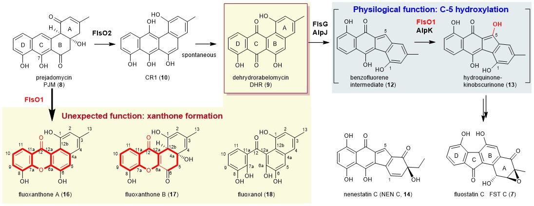 Fluostatin C (FST C, 7) is a marine-actinomycete (Micromonospora rosaria SCSIO N160) derived compound and belongs to benzofluorene-containing atypical angucyclines, the same class of kinamycin A. During our biosynthetic studies on FSTs, the monooxygenase FlsO2 was biochemically characterized by us to efficiently convert prejadomycin (PJM, 8) to dehydrorabelomycin (DHR, 9) through CR1 (10) (Fig. 1). To our surprise, the production of DHR (9) was still observed in the flsO2-inactivation mutant of M. rosaria SCSIO N160, although in minor amount (Org. Lett. 17, 5324, 2015). Given the presence of several highly similar monooxygenases in the FST biosynthetic gene cluster, we then hypothesized that one of these monooxygenases might compensate for the function of FlsO2 to convert 8 to 9. In the meantime, Professor Keqian Yang’s group, Institute of Microbiology, Chinese Academy of Sciences, reported that the monooxygenase AlpJ (a homologue of FlsG) catalyzed an oxidative B-ring cleavage and contraction to convert DHR (9) putatively to benzo[b]-fluorene intermediate (12) (Fig. 1). They also proposed that the flavoenzyme AlpK probably further hydroxylated 12 at C-5 to hydroquinone-kinobscurinone (13) (Chem. Commun. 51, 8845, 2015), which was indirectly confirmed by the Balskus’s group in a coupling reaction of AlpJK (J. Am. Chem. Soc. 139, 2864, 2017). Last year, we also performed the in vivo characterization of the flavoprotein monooxygenase (FPMO) FlsO1 as the C-5 hydroxylase that putatively converted 12 to 13 (Fig. 1), functionally equivalent to its homologous enzyme AlpK (J. Org. Chem. 86, 11019, 2021). However, the direct in vitro biochemical characterization of FlsO1 and AlpK was hampered by the inavailability of the highly instable substrate 12. Interestingly, we recently isolated an intermediate nenestatin C (14) (Fig. 1) from the biosynthetic pathway of nenenestatin A (Org. Biomol. Chem. 19, 4243, 2021), which had the same carbon scaffold as 12 and could serve as a potential substrate mimic of 12.