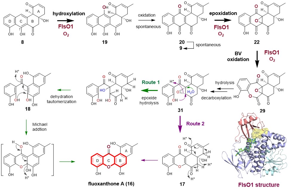 To address whether another FPMO in the FST pathway can complement the function of FlsO2, we overproduced four enzymes FlsO1, FlsO3, FlsO4 and FlsO5 to probe their activity toward 8. Although FlsO3‒O5 are inactive, to our delight, FlsO1 indeed can efficiently convert 8 to 9. This observation satisfies our curiosity to find the enzyme sharing the same function as FlsO2. More impressively, FlsO1 not only catalyzes the conversion of 8 to 9, but also is capable of transforming 8 into multiple products, which are characterized as xanthone-containing products 16 and 17 and the C-ring opening compound 18 (Fig. 1). This is a bona fide unexpected finding. We then performed a series of experiments, including time course study on the FlsO1 reaction with 8, intermediates/shunt products characterization, and isotope-labeling studies (18O2 and MeOH-d4) to eventually led to an-experiment-data supported hypothesis of the FlsO1-catalyzed xanthone formation. It involves three-step successive oxidations (including hydroxylation, epoxidation and Baeyer-Villiger oxidation) (Fig. 2). In brief, FlsO1 first catalyzes C-12 hydroxylation of PJM (8) to 19, which spontaneously becomes 20, which could undergo spontaneous dehydration to 9. Then, FlsO1 catalyzes a second oxidation, namely epoxidation of 20, to afford 22. Subsequently, FlsO1 catalyzes a third oxidation, a Baeyer-Villiger reaction of 22, leading to 29. Finally, 29 can undergo a series of spontaneous reactions to eventually give rise to the xanthone products 16 via two putative routes (routes 1 and 2, Fig. 2).