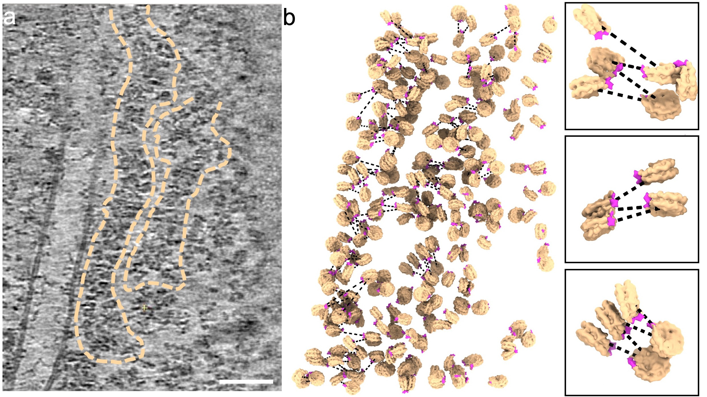 Figure 1 Organisation of nucleosomes in native chromatin fibres. a) A representative tomographic slice of chromatin fibres in the nucleus (from n = 5). Prominent fibre structures are indicated by dash outlines. Scale bar = 50 nm. b) Mapping of nucleosomes in chromatin fibres. Nucleosomes are mapped back to the tomogram based on their coordinates and orientations. The partial density of H1 is coloured magenta, indicating the entry and exit of the linker DNA, based one which, the DNA path (dashed lines) is predicted. Three sub-regions (circled) are showcased on the right panel.
