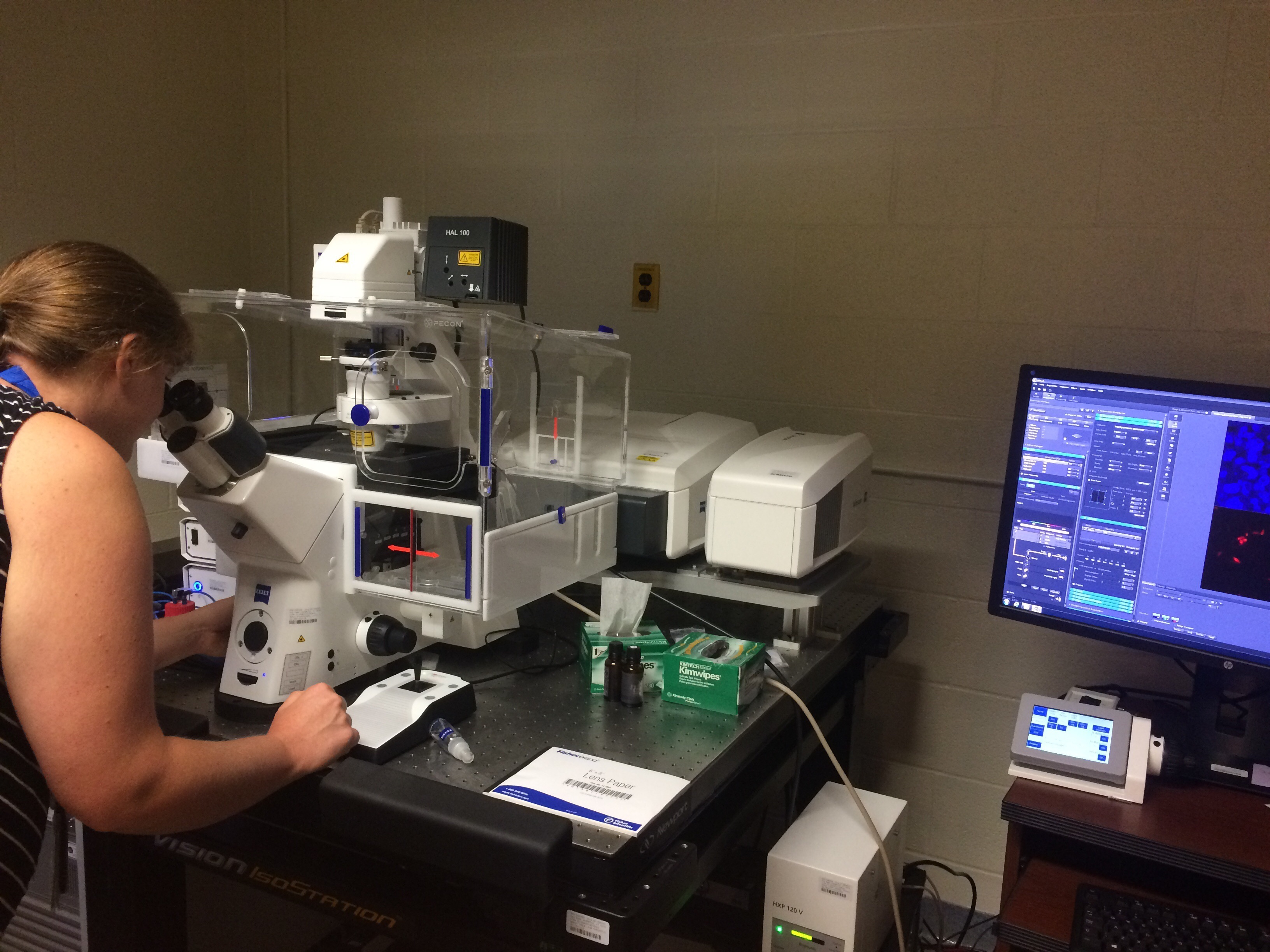 USAMRIID researcher imaging immunofluorescence stained FFPE tissue slides on Zeiss LSM 880 confocal microscope